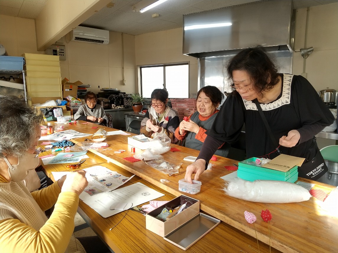 新年会では、まず全員で童謡「1月1日」を合唱し、和やかな雰囲気の中、手芸教室「チューリップ作り」を楽しみました。菅野冨美子支部長の指導のもと赤やピンクの生地を使い、参加者全員で100本を超えるチューリップを完成させました。出来上がったチューリップは、2月4日から6日に開催される作品展に出品する予定です。お昼には、菅野支部長手作りの甘酒で乾杯し、参加者が持ち寄ったお惣菜とともにお弁当を味わいました。参加者は「みんなで食べるご飯はおいしいね」「たくさんのチューリップがひとつにまとまると素敵だね」と話しました。