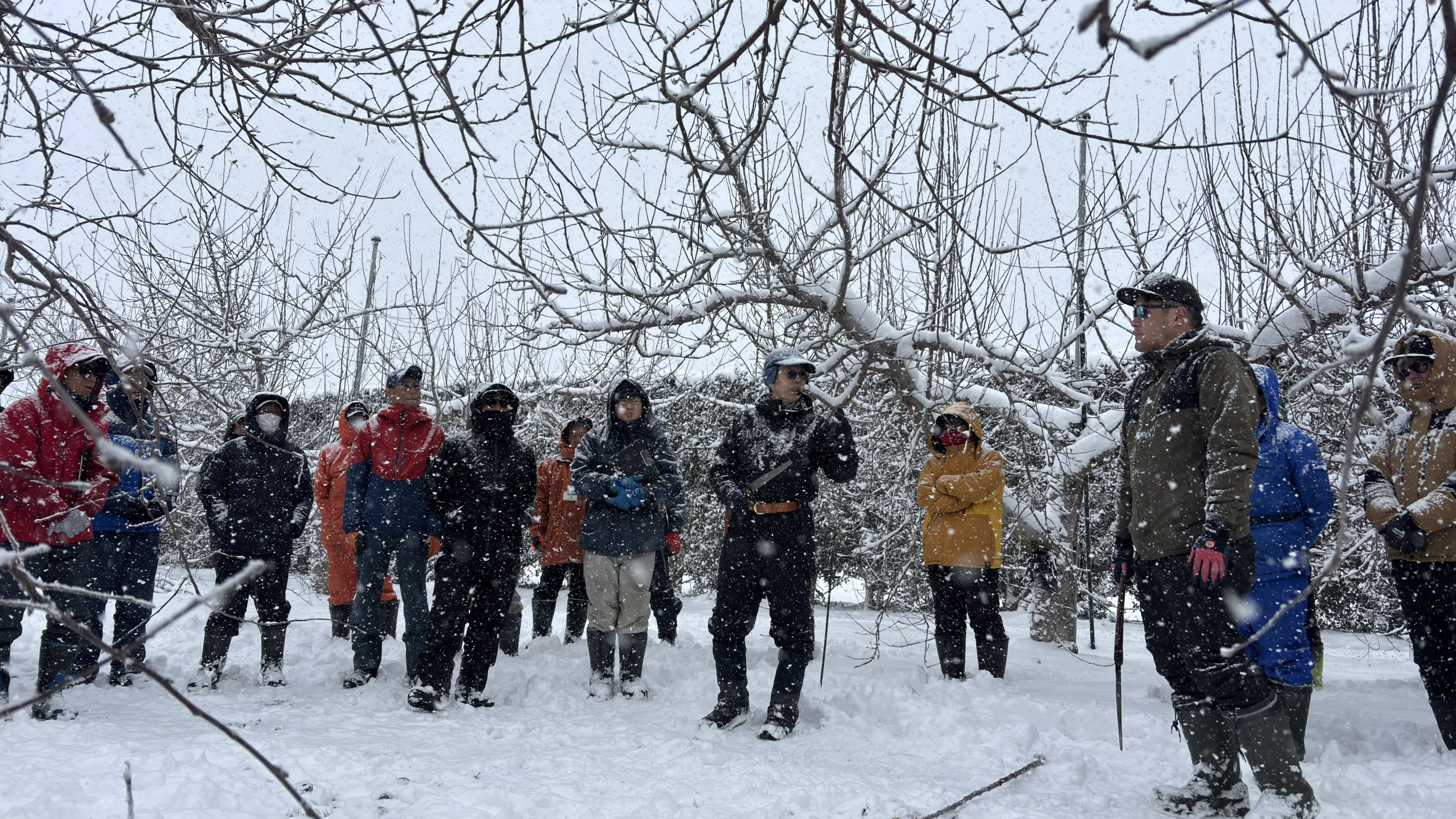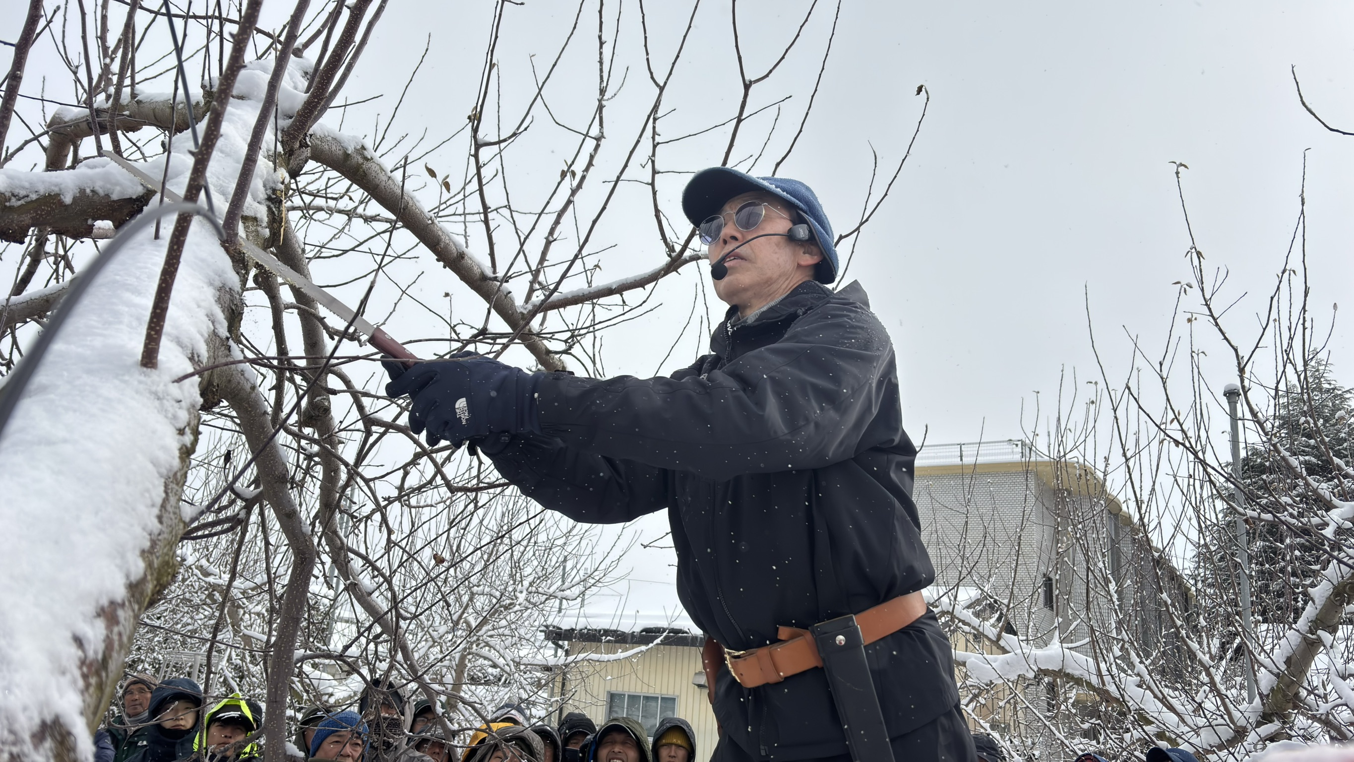 講師には、リンゴ生産日本一の青森県から青森県りんご協会の山本富幸専務を招きました。山本専務は、リンゴ「ふじ」の剪定について、実際にふじ丸葉台の木を使いながら実演を交えて説明しました。