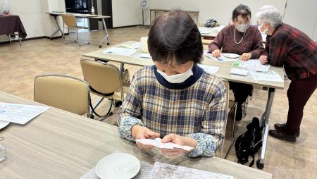 参加者は丸型または四角型のプレートを選び、さまざまな模様の転写紙から好みのイラストを切り取り、プレートに貼り付けてオリジナルデザインに挑戦しました。完成した作品は、講師が持ち帰り電気釜で焼成した後、後日お渡しです。部員は「自分でお皿をデザインできてとてもうれしい。焼き上がりがすごく楽しみ!」と話しました。