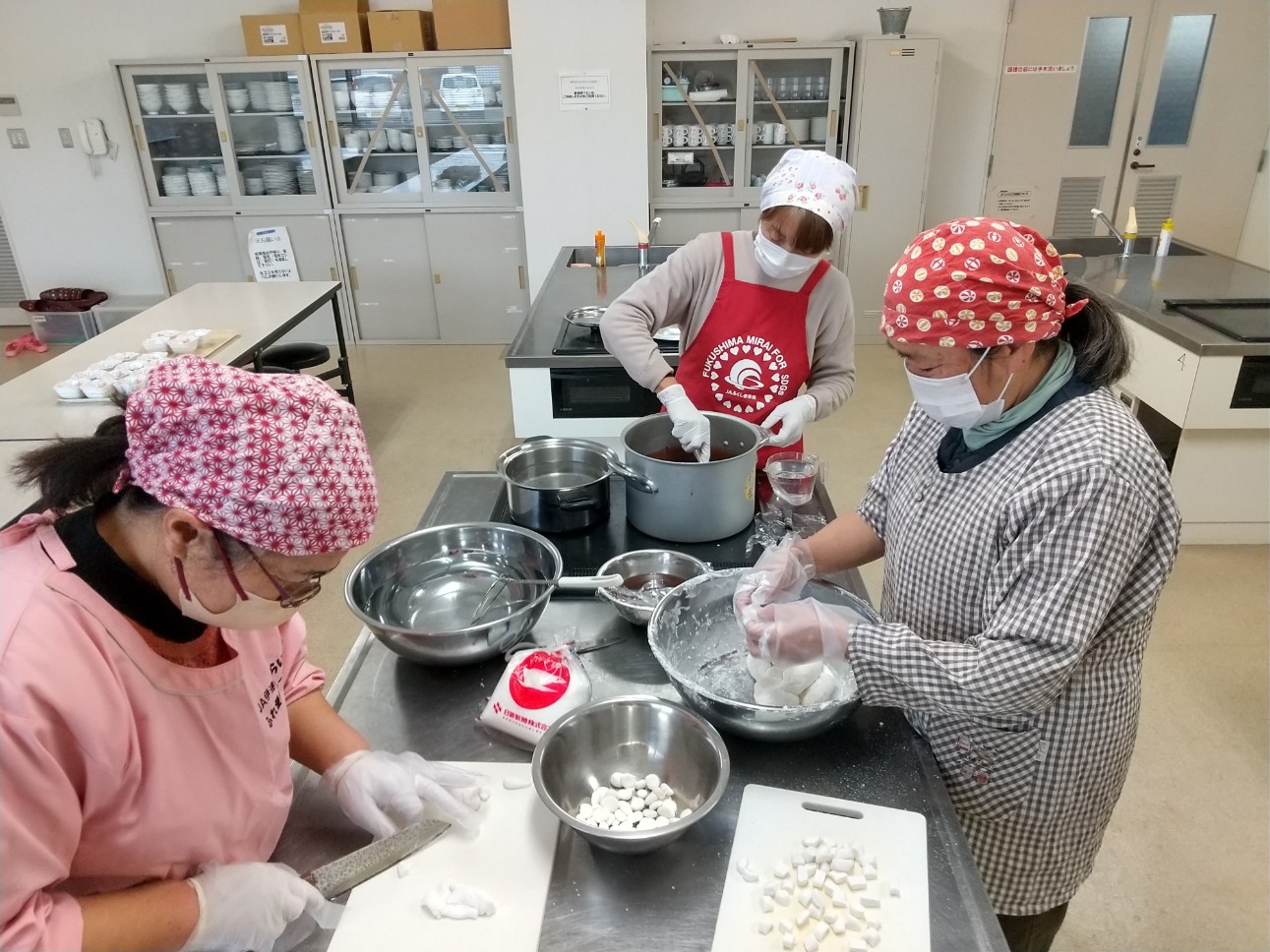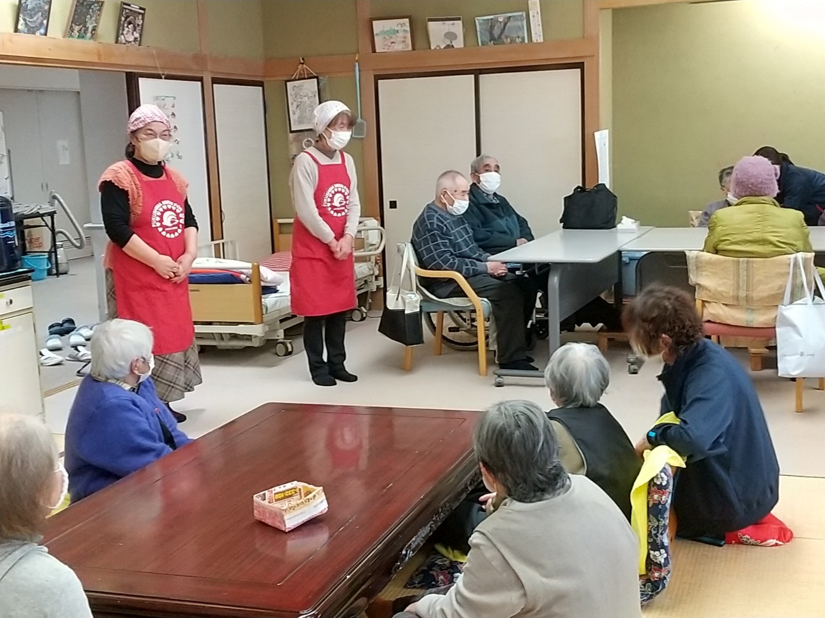 利用者約40名分のおやつとして白玉団子のお汁粉を調理しました。白玉団子は、柔らかめに練って小さなだんごにし、こしあんをかけて提供しました。よつば会代表の直江いち子さんは「ゆっくりお召し上がりください」と呼びかけました。ボランティアグループの会員らは「利用者の皆さんの元気な顔を見ることができてうれしい」と話し、温かい交流の場となりました。