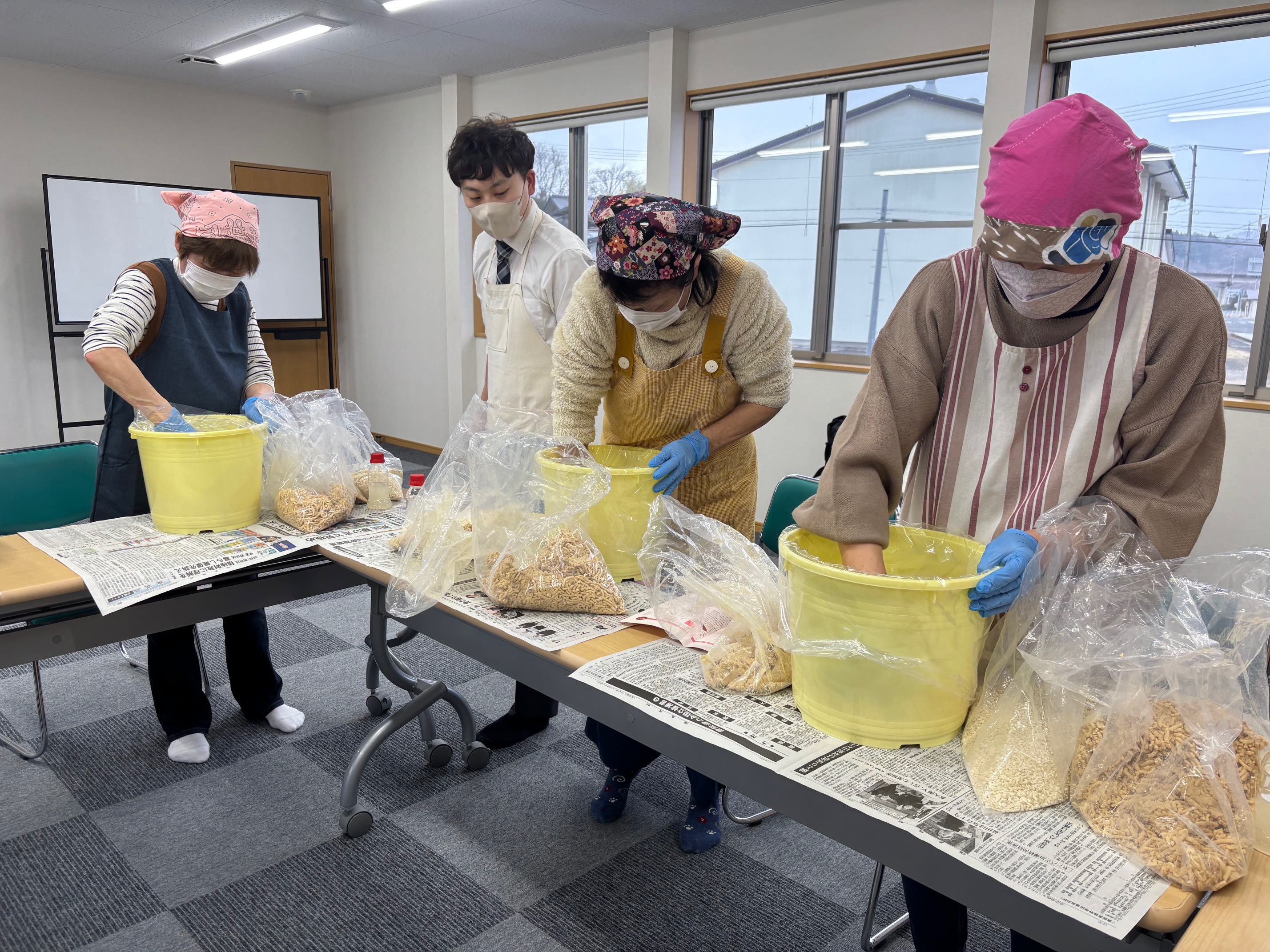 当JA女性部松川支部と金谷川支部は、1月29日に味噌作り教室を開催しました。午前は松川支部、午後は金谷川支部の部員計13名が参加し、講師の内池醸造(株)伊藤和真さんの指導のもと、大豆を潰して塩切こうじや種水と混ぜる作業を体験しました。
