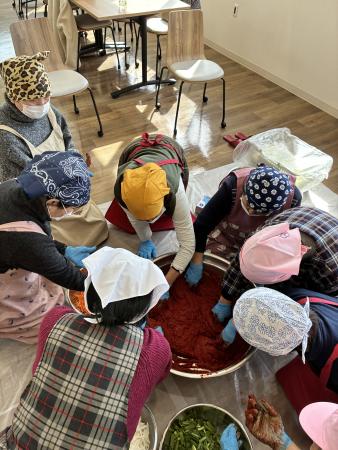 当日は、NPO法人ふくかんねっとのチョン・ヒョンスク氏を講師に迎え、教室では、大根やねぎなどの野菜を刻み、にんにく、あみの塩辛、唐辛子などを混ぜ合わせた調味料を作成。完成した調味料を塩漬けした白菜の葉一枚一枚に丁寧に塗り込み、本格的な即席キムチづくりを体験しました。