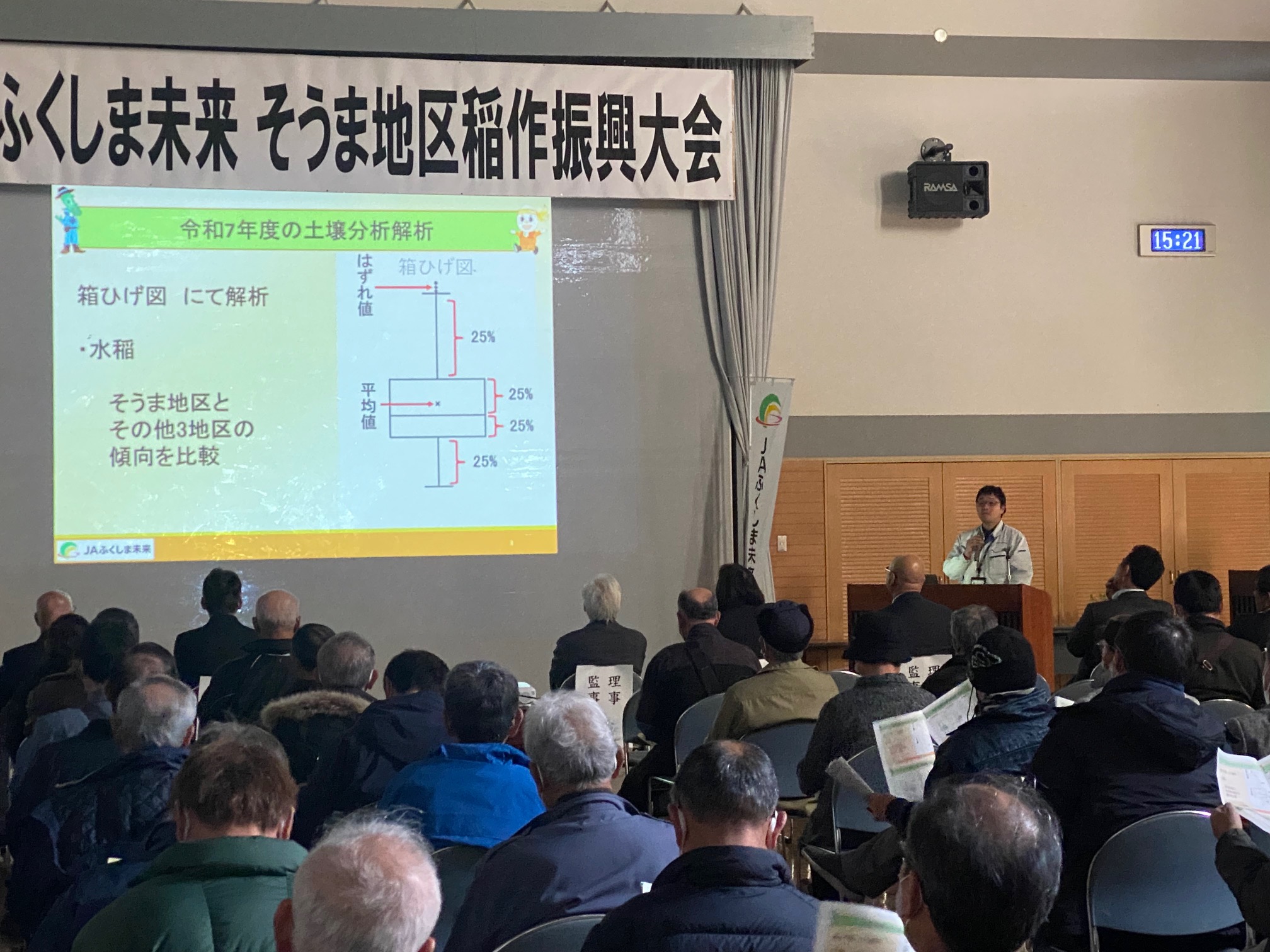 大会では、相双農林事務所の菅野拓朗主査が2025年度産米の生育概況と次年度への対策を報告。本年度は生育期間を通じて高温・多照となり、平年を上回る収量となりました。出穂期以降も高温が続いたが、玄米の品質への影響は少なかったとのこと。次年度に向けては、高温対策としてケイ酸資材の施用や過剰分げつの抑制、追肥による葉色の維持、飽水管理など複数の対策を組み合わせる必要性が示されました。また、除草剤抵抗性のノビエ類が発生しているため、注意喚起がなされました。