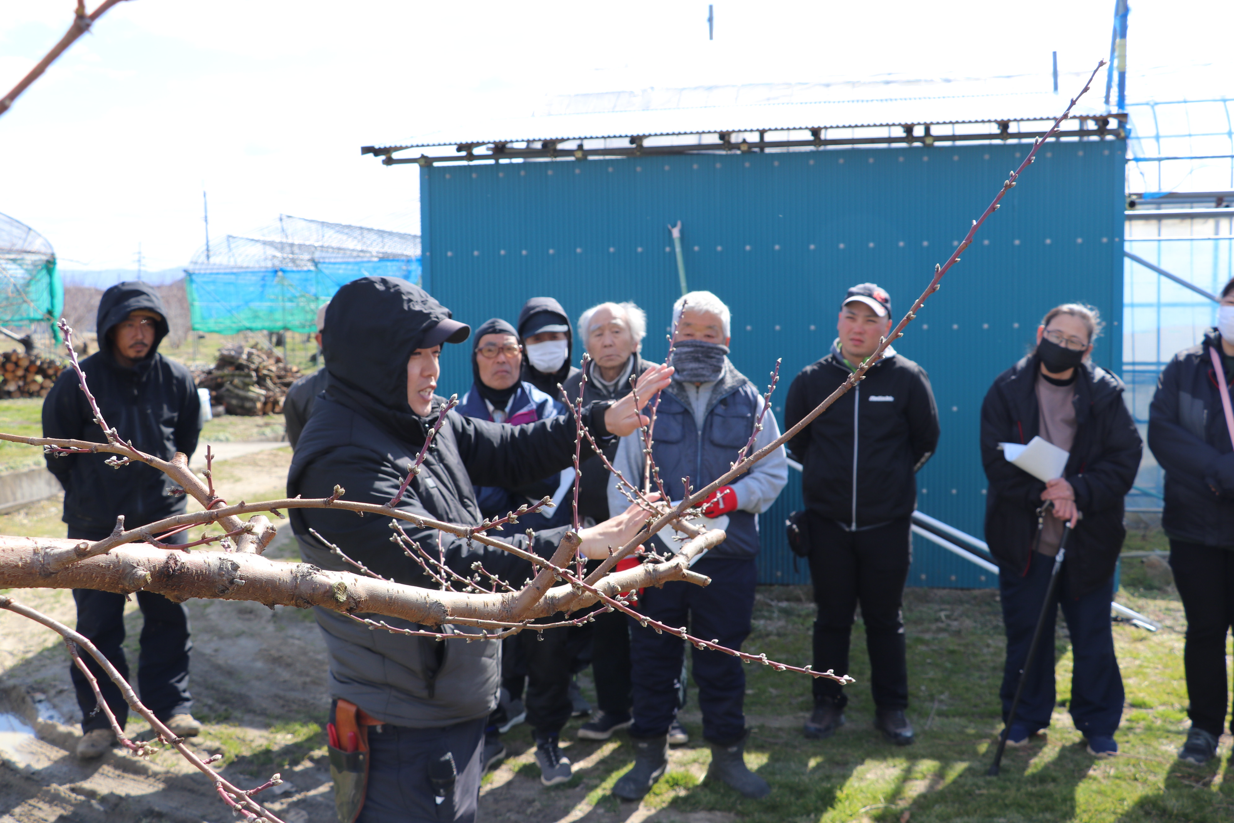 摘蕾は、花芽の数を調整することで樹勢の維持や果実の肥大、品質向上につなげる重要な管理作業です。指導会では、JA飯坂営農センターの藤山雄斗係長が、枝の状態を確認しながら花芽の残し方や作業の進め方について説明。参加者は実際の樹を前に、作業のポイントを確かめました。