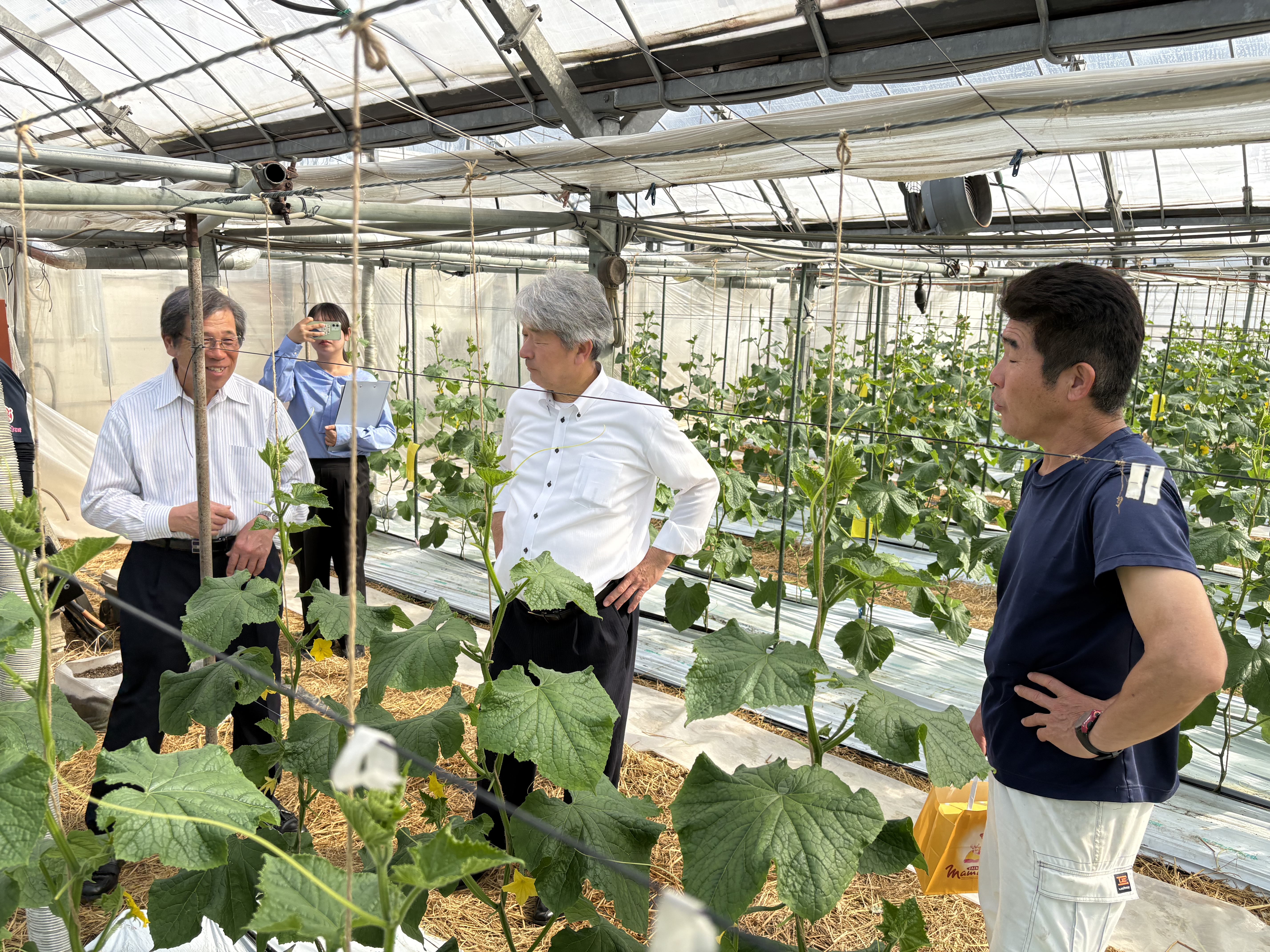現地では、両県の産地状況や販売戦略を意見交換。宮崎では「キティちゃん」を使った販促や、福島の「キュウリビズ」など、消費者へのPR手法を共有しました。圃場(ほじょう)視察では、天敵の導入やワクチン苗の課題、苗価格の違いなど現場の最新事情を情報交換。選果場では効率的な出荷体制や人材確保の工夫も学びました。