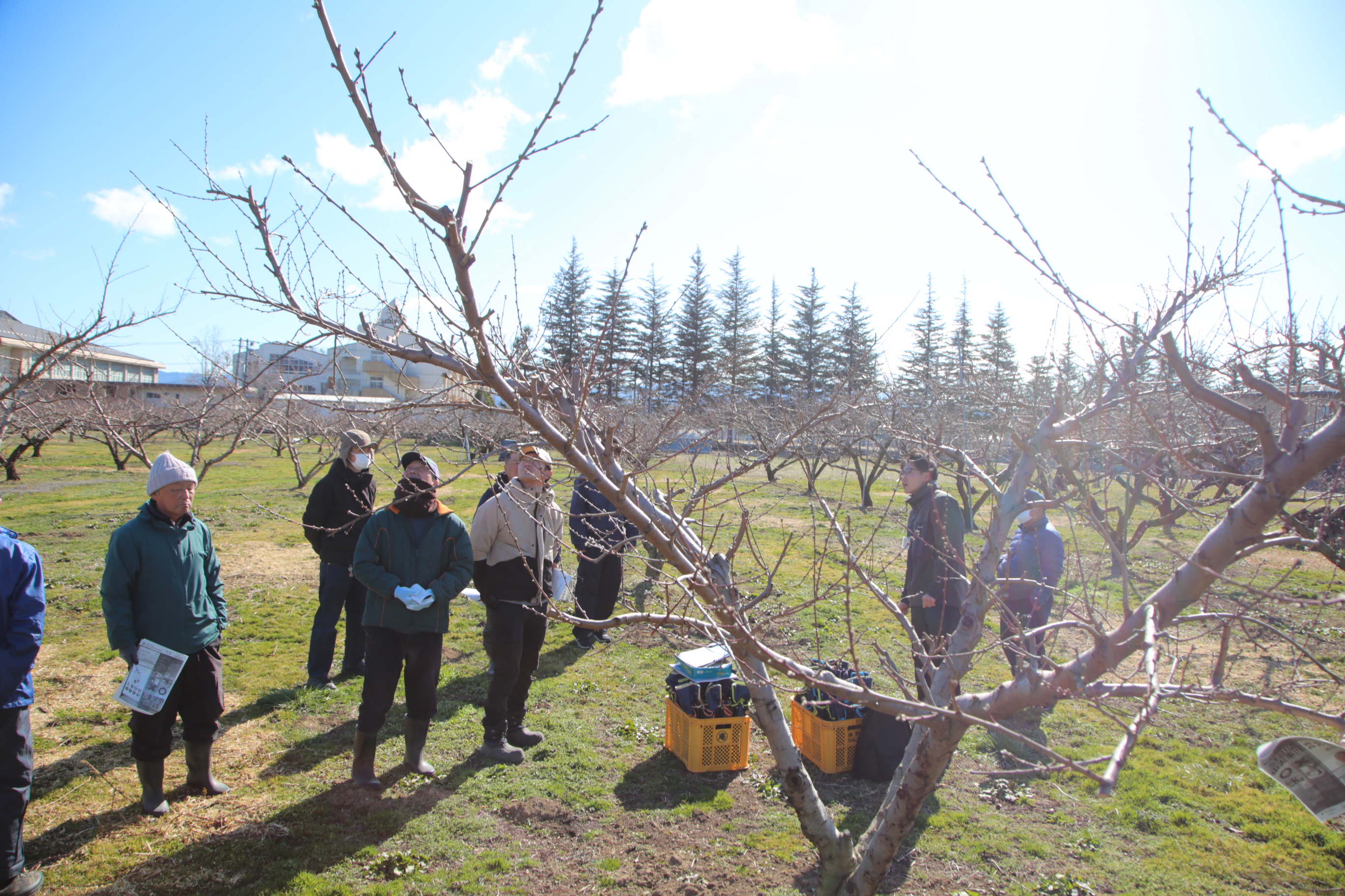 当JA伊達地区モモ生産部会保原支部は12日、伊達市内の桃畑で摘蕾指導会を開き、生産者12人が参加しました。指導会は保原支部管内の計5カ所で実施され、各会場で生産者が熱心に技術習得に励みました。