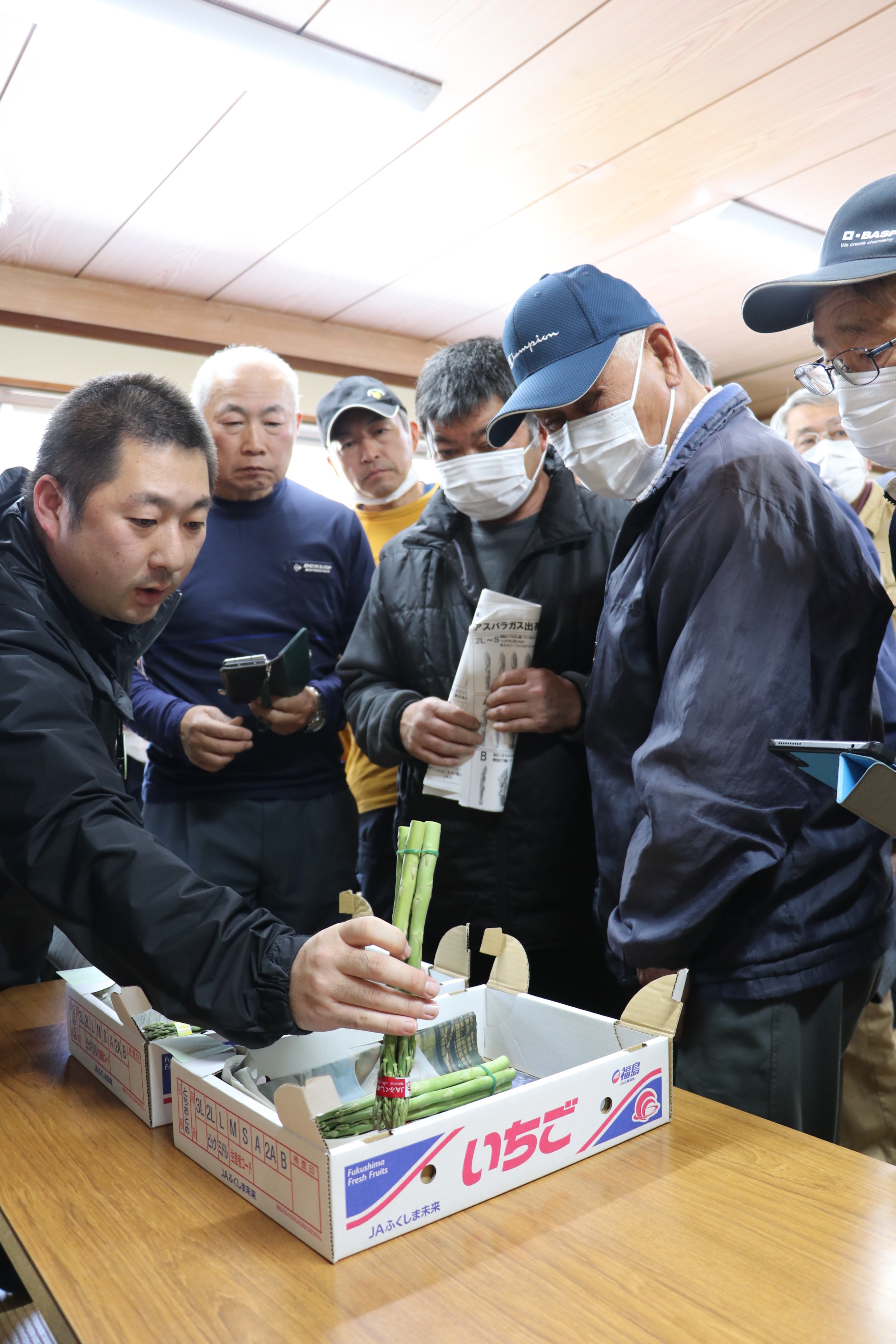 当JA伊達地区アスパラガス生産部会は23日、桑折町のJA桑折共選場で、本格的な出荷を前にした栽培管理指導会と目ぞろえ会を開きました。生産者や県県北農林事務所、JA全農福島、JAの担当者ら約30人が参加し、栽培管理の留意点や販売実績、出荷規格を確認しました。
