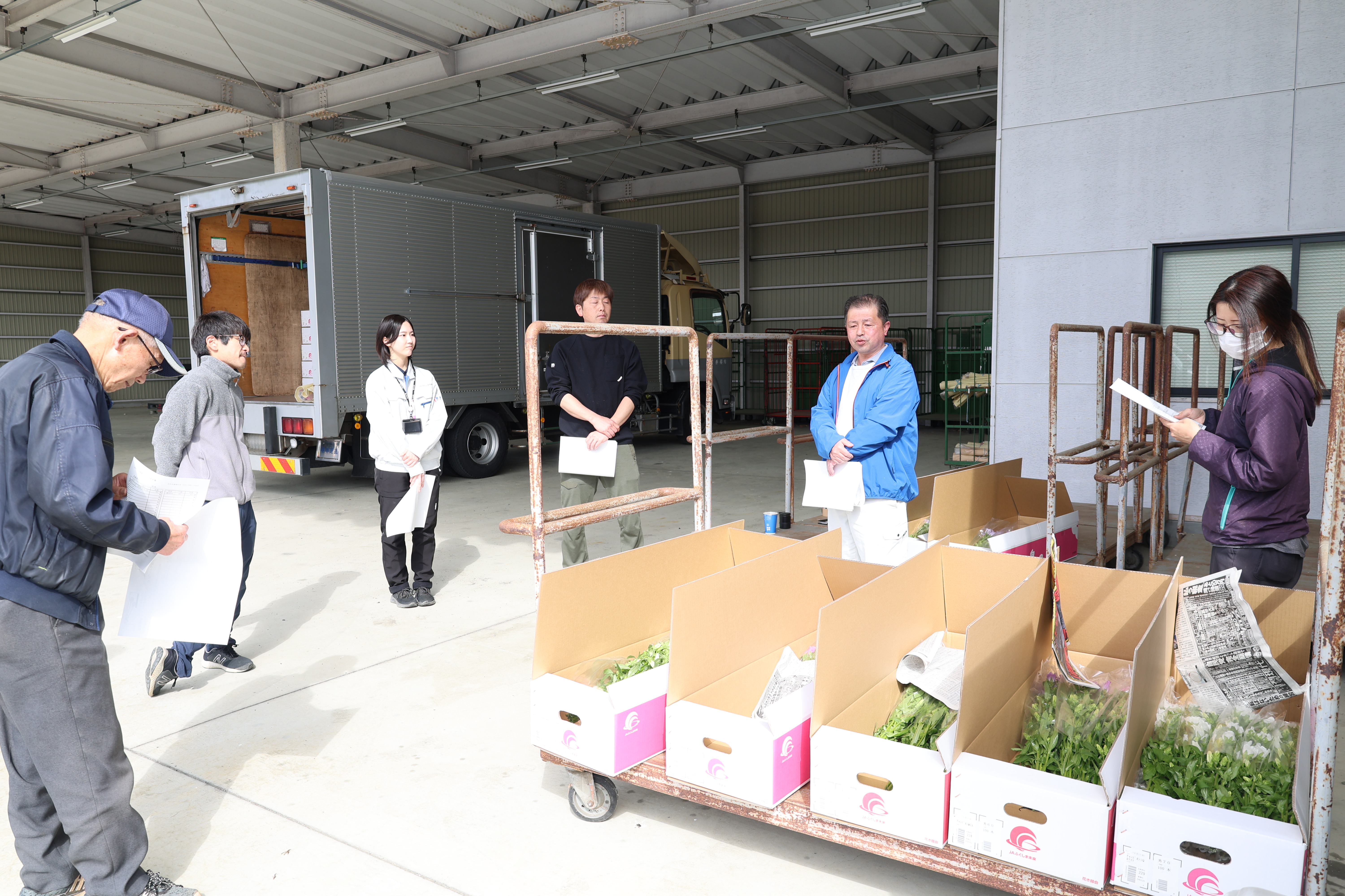 1日、二本松市の大平集出荷場で目ぞろえ会を開きました。生産者やJA職員7人が参加し、出荷規格や収穫、出荷時の注意点を確認しました。