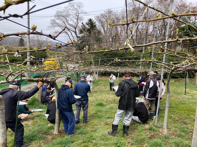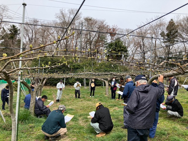 今年の満開予定日は平年より6日ほど早い見込みです。指導会では、ナシの摘蕾、摘花のやり方や人工受粉のポイント、凍霜害対策について説明がありました。担当者は、気温の推移に注意しながら栽培管理を行うとともに、農作業の事故防止に努めるよう呼びかけました。