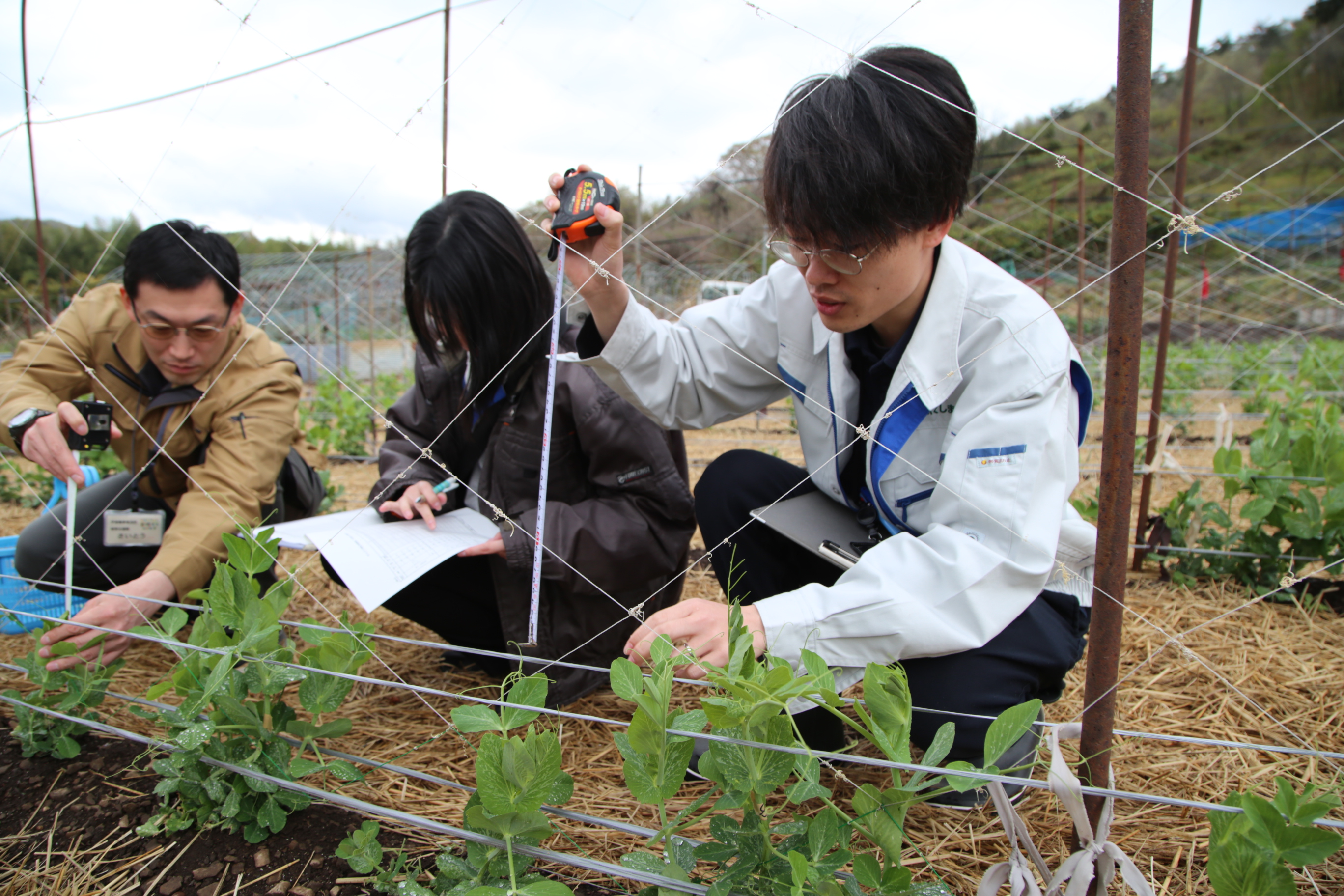 JA営農指導員、同普及所普及員ら計7人が参加。管内2地域でサヤエンドウ、スナップエンドウ、グリンピースの草丈などを確認。生育進度や病害虫発生の有無を調べました。