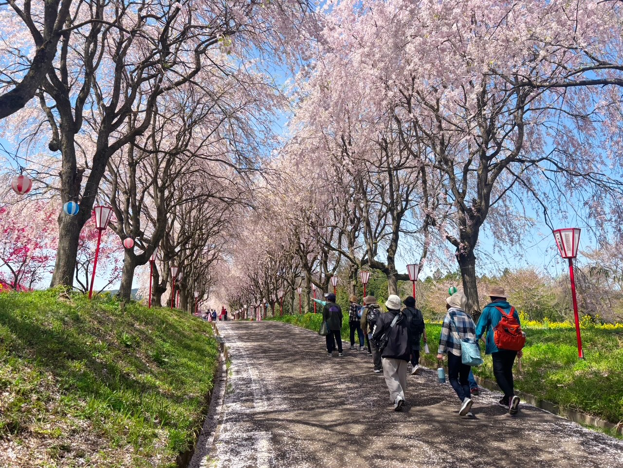 未来館みずはらを出発し、往復約3.5kmを歩きながら春の景色を楽しみました。右輪台山では108本のしだれ桜が咲き誇り、多くの来場者で賑わっていました。昼食後の役員会で今年度の活動について話し合いました。