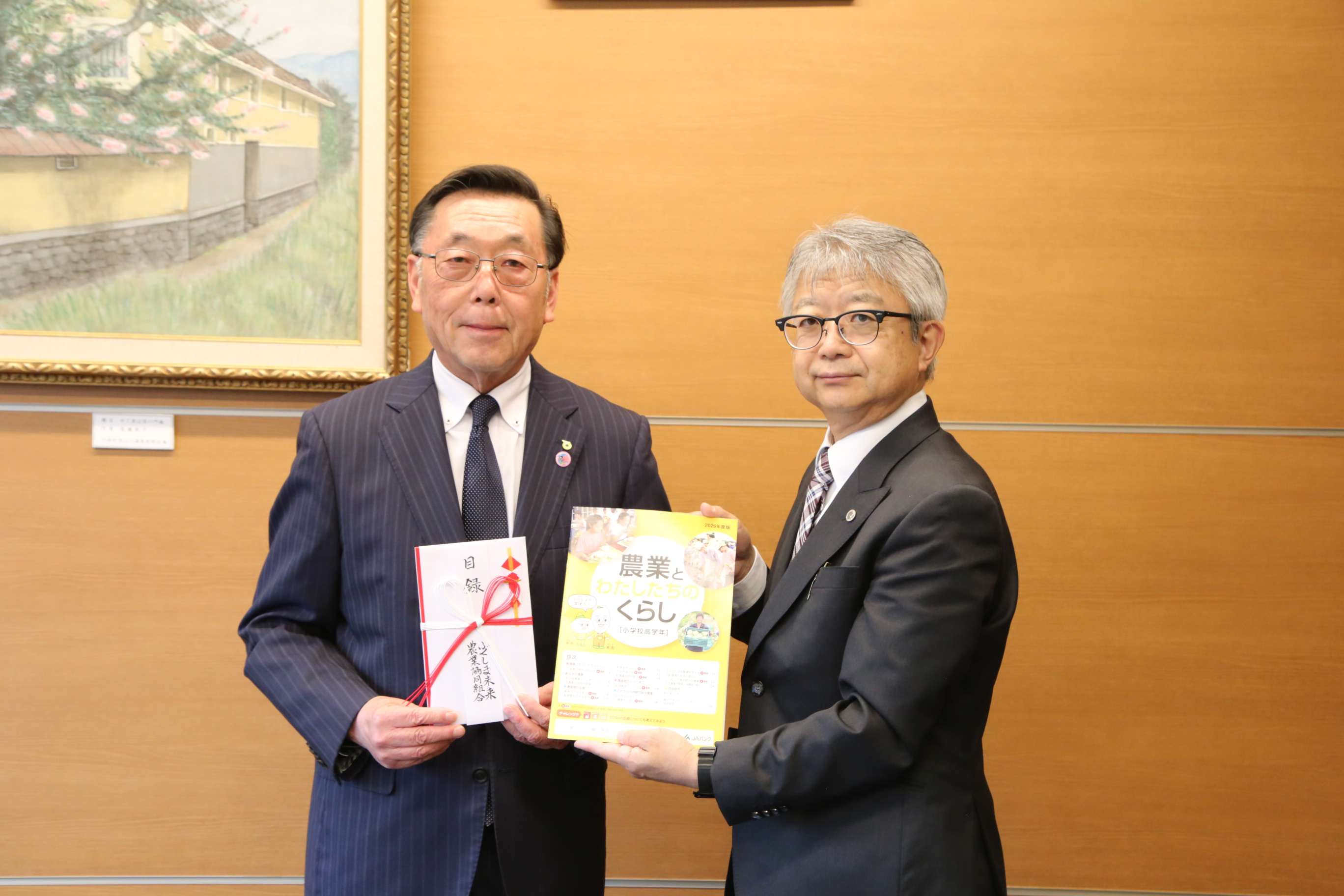 当JA福島地区本部は27日、次世代への食農教育の一環として、小学生向けの補助教材「農業とわたしたちのくらし」を福島市と川俣町の教育委員会に贈呈しました。管内の小学校計44校へ、合計2045冊が届けられます。