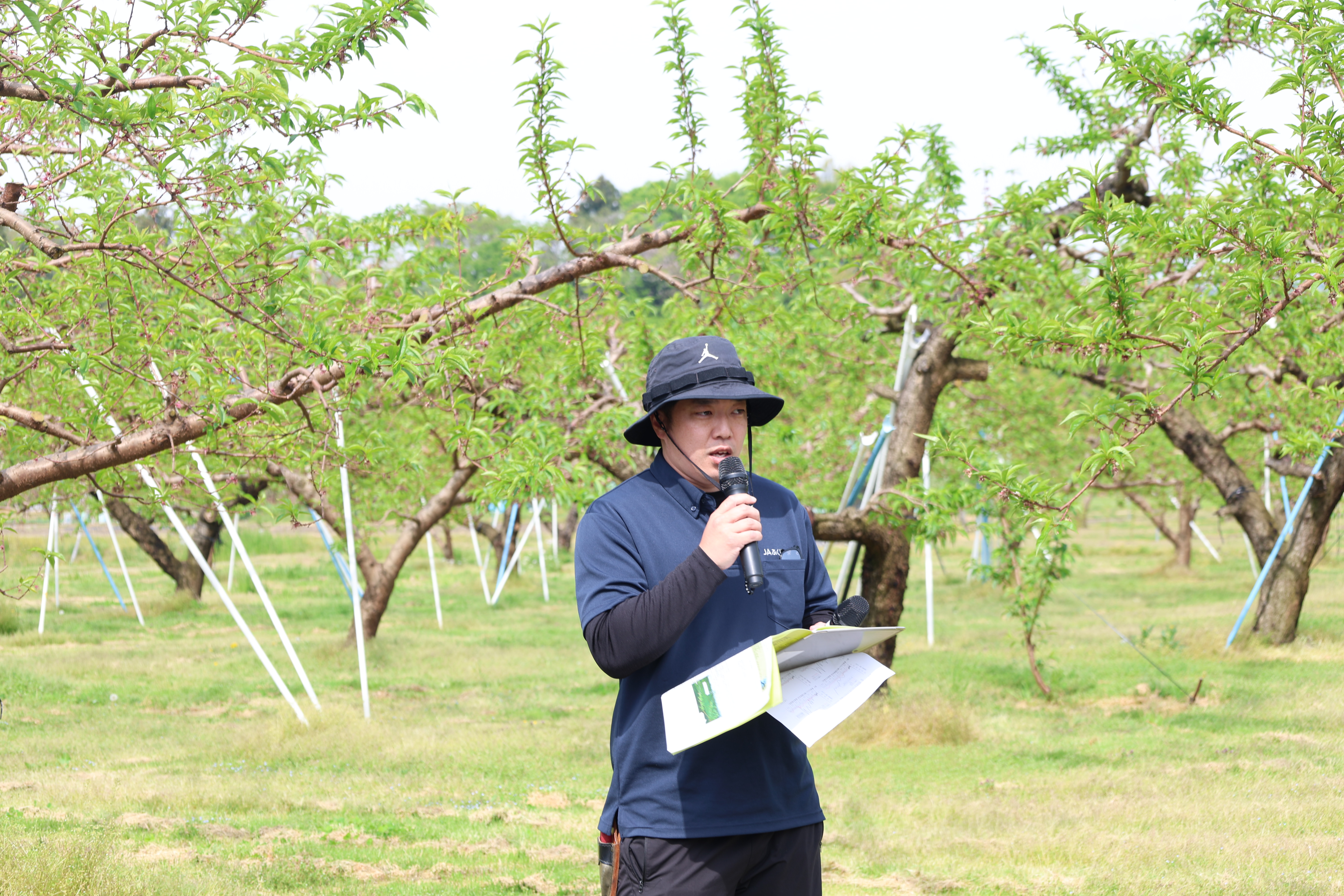 藤山さんは「こまめに園地に足を運び、結実状況を確認しながら作業してほしい。せん孔細菌病やカメムシにも注意するように」と話し、昨年よりも前倒しで栽培管理に取り組むよう呼びかけました。
