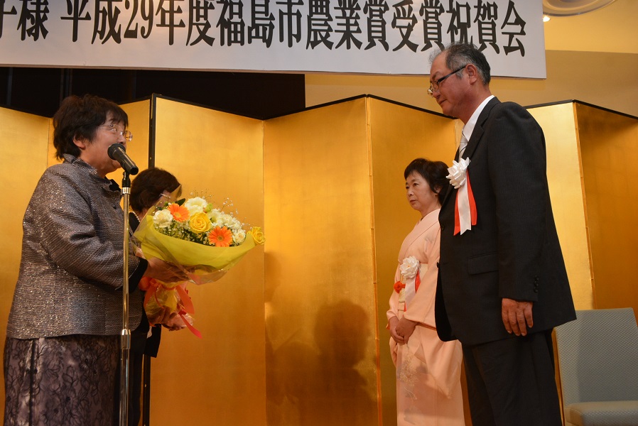 祝賀会では衆議院議員の亀岡偉民議員や福島市の山本克也副市長、JAの菅野孝志組合長が祝辞を述べ、出席者が花束や記念品を贈りました。喜広さんは「今回の賞を受賞できたのも、皆さんの支えがあったから。これらに感謝し、これからも農業の発展に尽くしたい」と話しました。