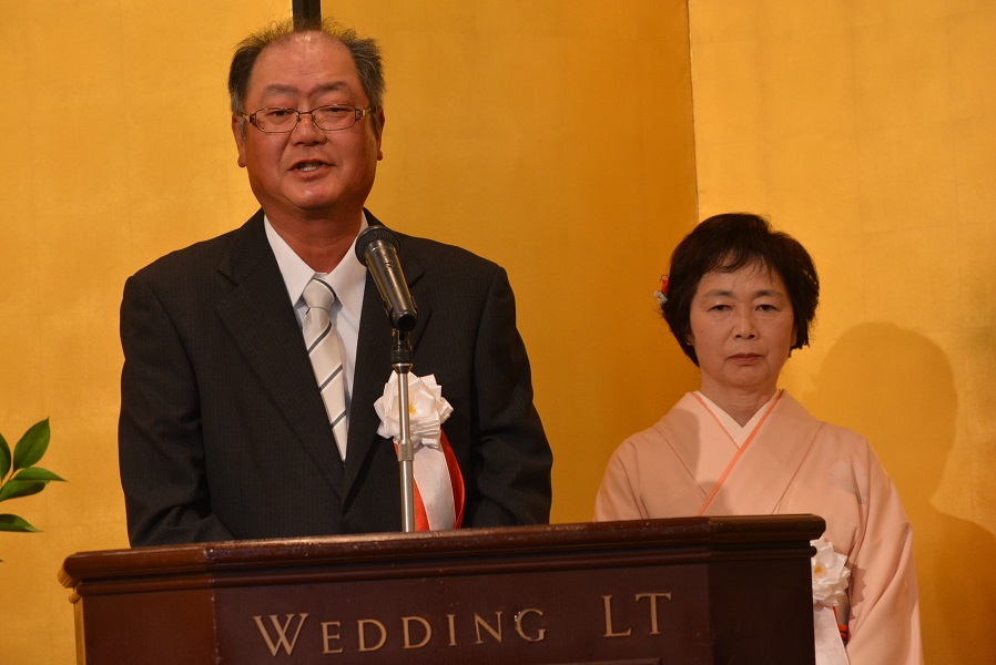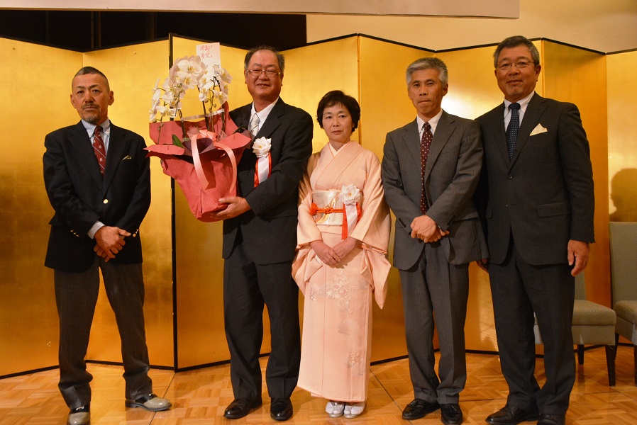 福島市沖高でモモ・ブドウ・リンゴを栽培する末永喜広さん・初子さん夫妻が平成29年度福島市農業賞を受賞し、7日、受賞祝賀会がウエディング・エルティで開かれました。生産者仲間や関係者など約100人が出席し、末永さん夫妻と一緒に受賞を喜び合いました。