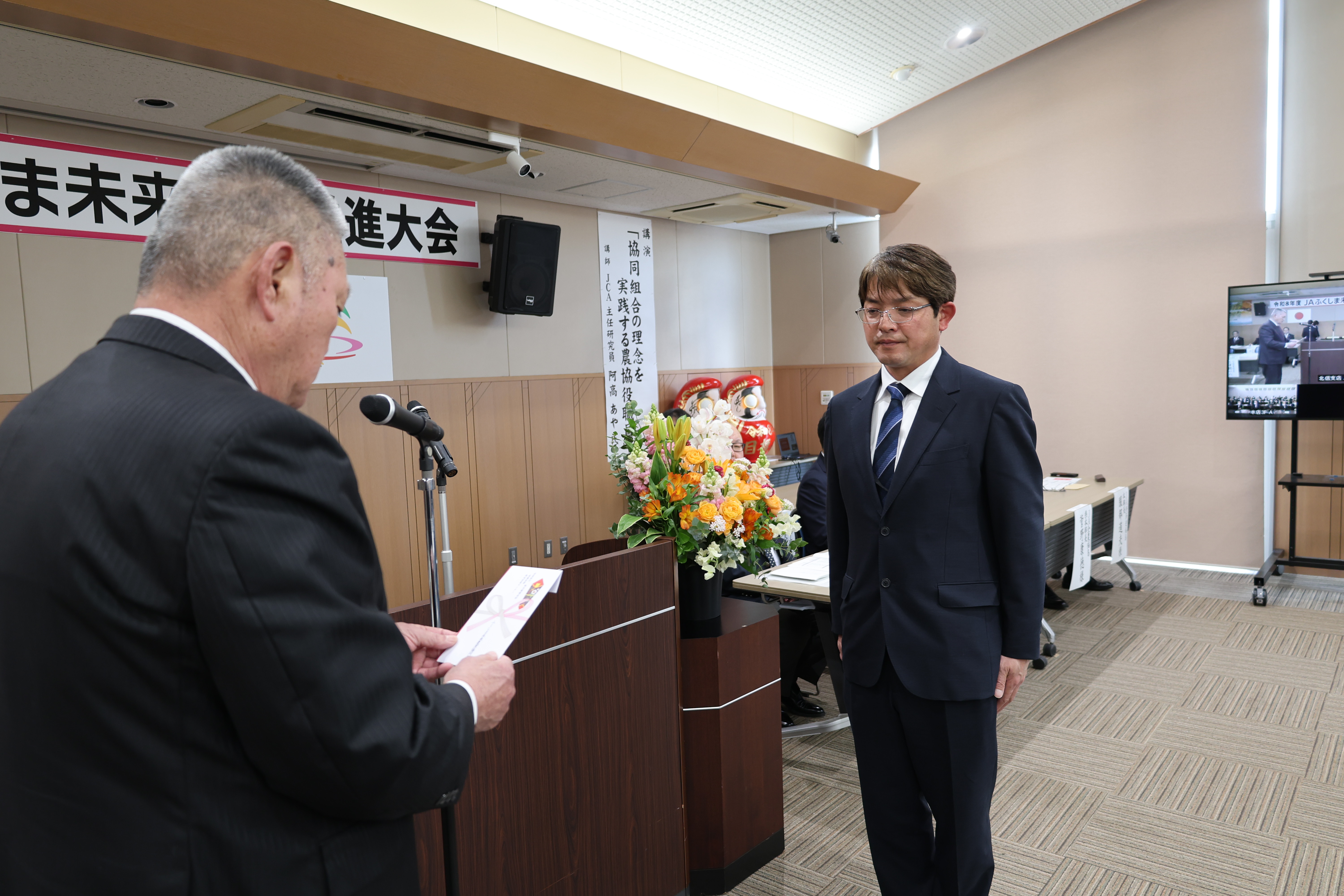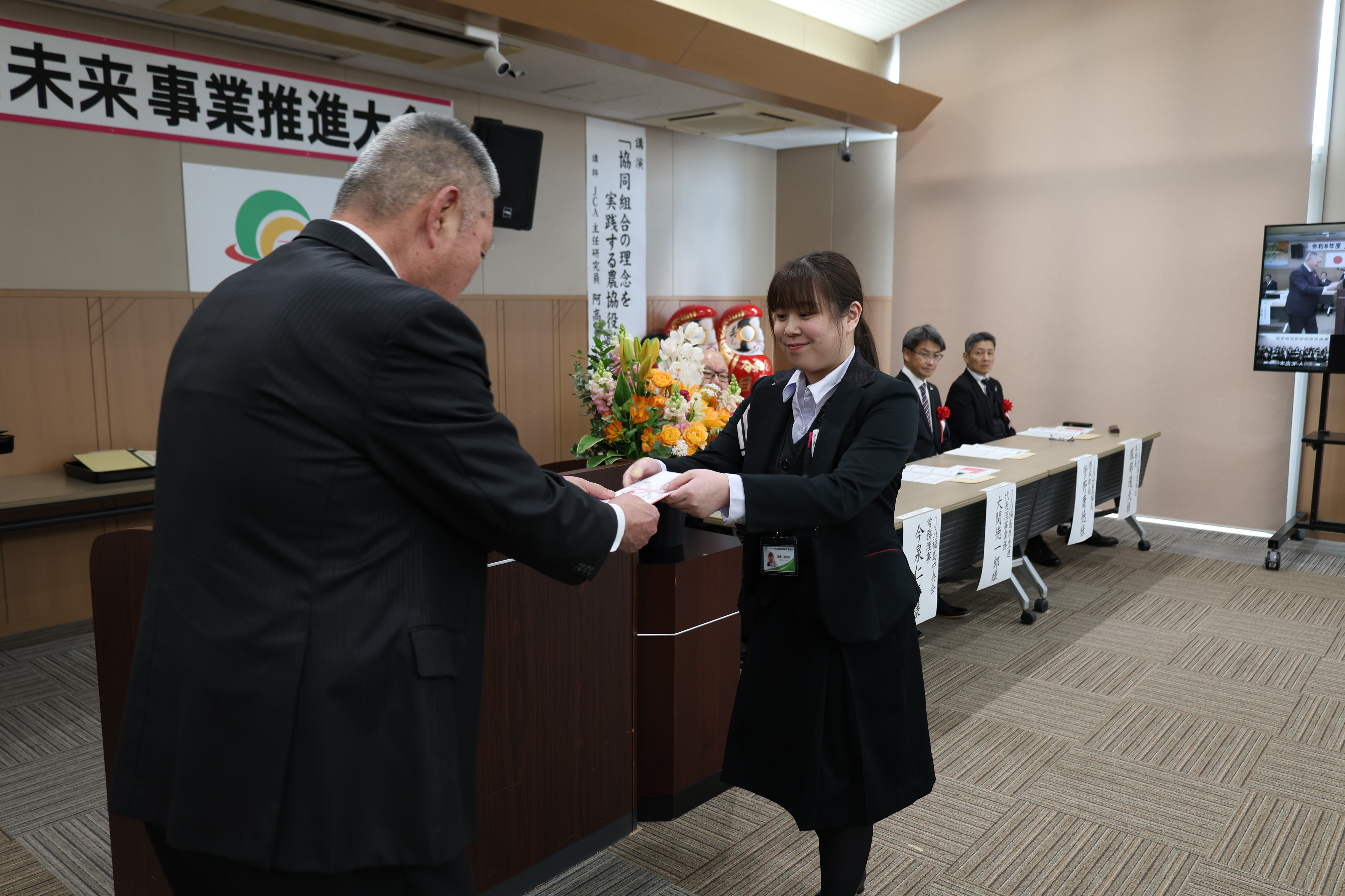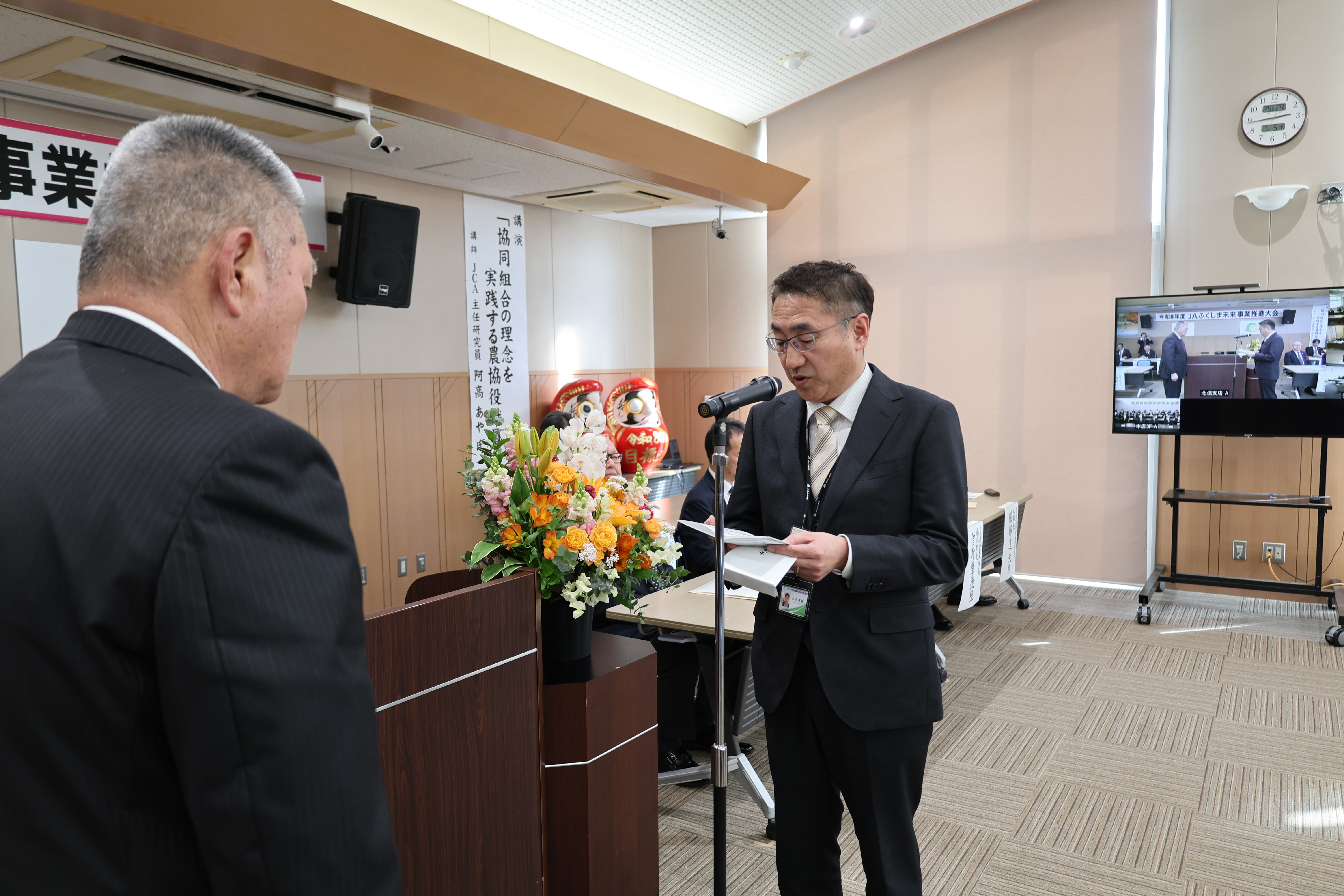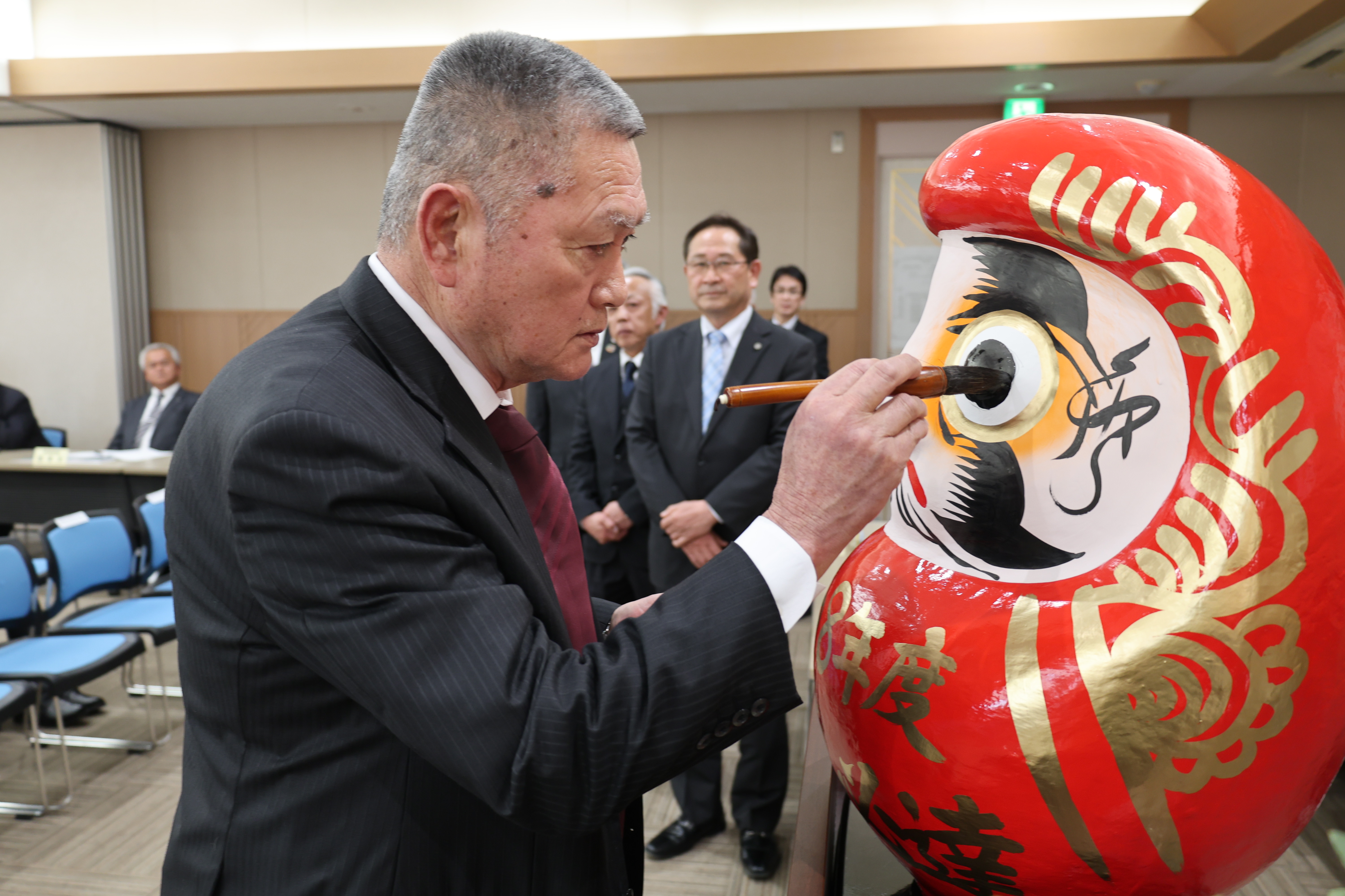三津間一八組合長らは目標達成祈願だるまに入瞳しました。三津間組合長は「担い手不足や資材の高騰などJAや農業を取り巻く環境は厳しくなっている。農業者に寄り添い、一つひとつの課題に立ち向かいながら、未来を見据えて日本一のJAを目指していこう」と呼びかけました。福島地区北部エリア代表支店長の山田廣嗣さんは「相互扶助の精神や協同組合の理念を大切に、事業計画の達成に全力で邁進していく」と決意を語りました。