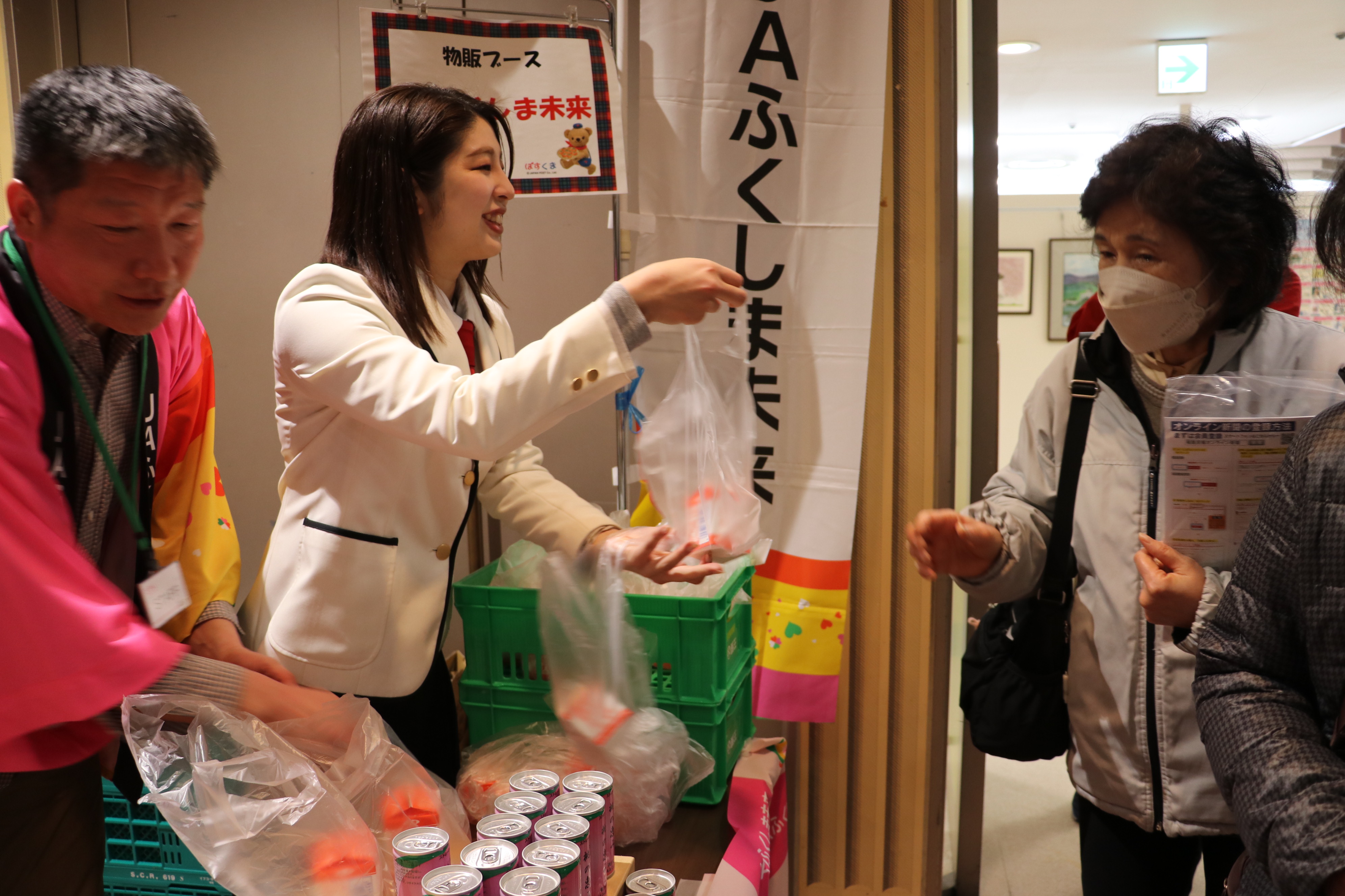 当JAは、日本郵便東北支社と福島民報社が主催したイベント「ふくしまから届けよう 文字活ぽすくまin福島」に参画し、来場者に県産農産物をPRしました。同イベントは福島県政150周年記念とふくしまデスティネーションキャンペーンの一環として開かれました。郵便局とは農産物のカタログ販売などを通じて連携しており、今回のイベントでも福島の特産品の魅力発信に取り組みました。