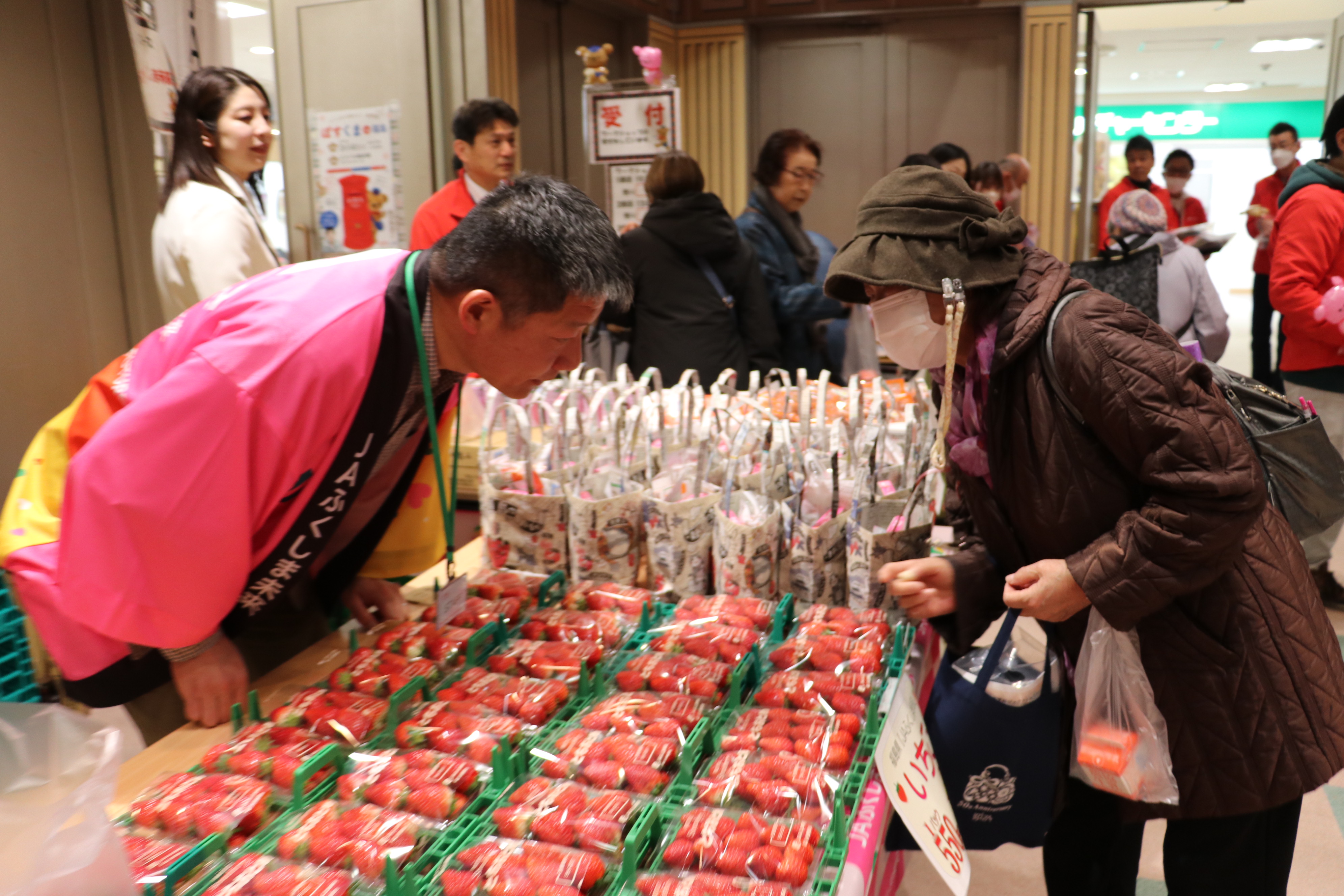 会場のエスパル福島では、イチゴ「とちおとめ」や伊達のあんぽ柿 、6次化商品などを詰め合わせたセットを販売し、来場者に福島の農産物の魅力を発信しました。