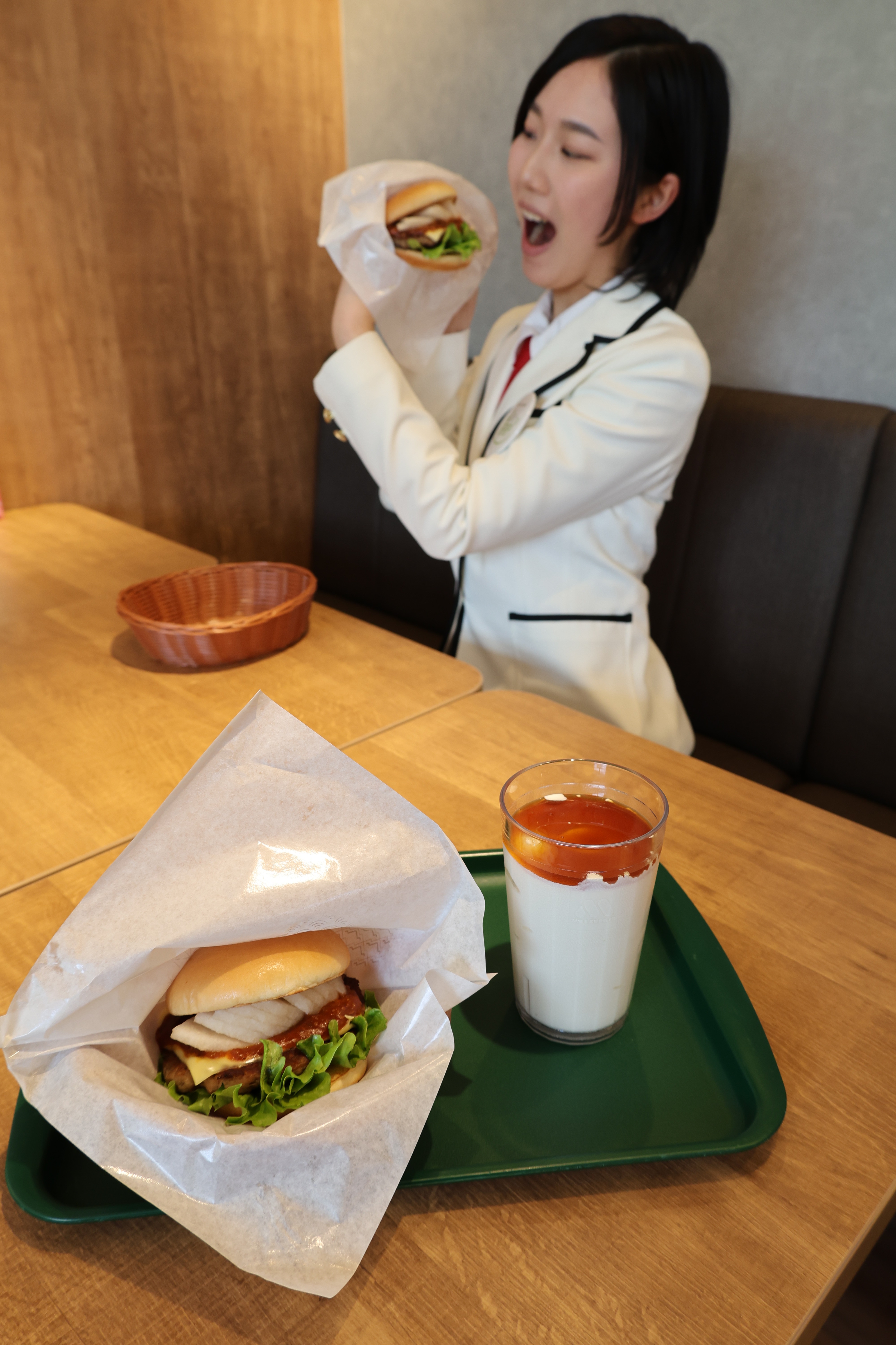 限定商品は、「福島黒毛和牛バーガー ~福島県浪江町産サムライガーリック入り会津味噌ソース&福島市産晩三吉(おくさんきち)使用~」と「まぜるシェイク もも紅茶 ~福島県産あかつき入り~」の2品。JAふくしま未来管内で生産された梨「晩三吉」と桃「あかつき」が使われています。