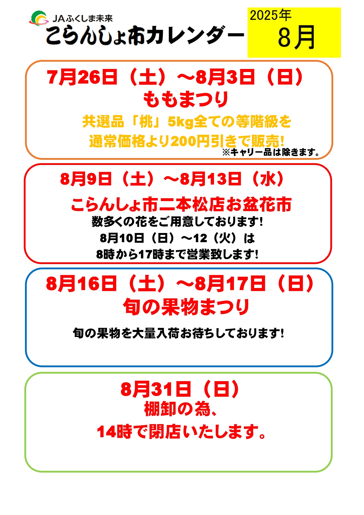 農産物直売所「こらんしょ市二本松店」8月イベントカレンダー