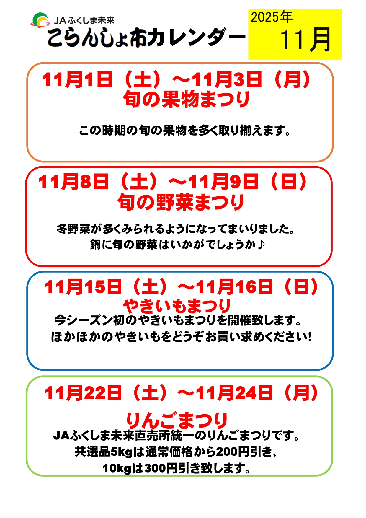 農産物直売所「こらんしょ市二本松店」11月イベントカレンダー