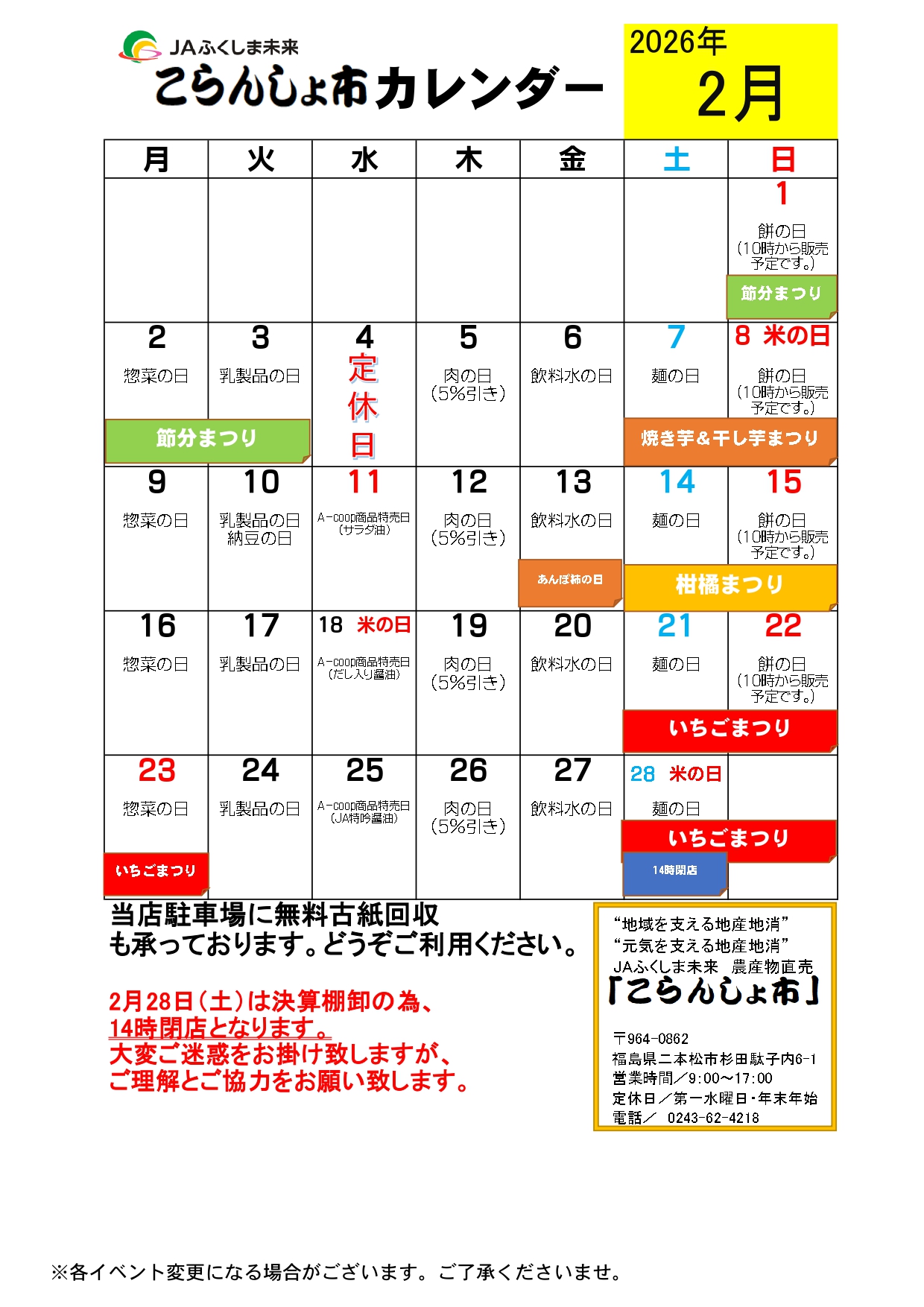農産物直売所「こらんしょ市二本松店」1月イベントカレンダー