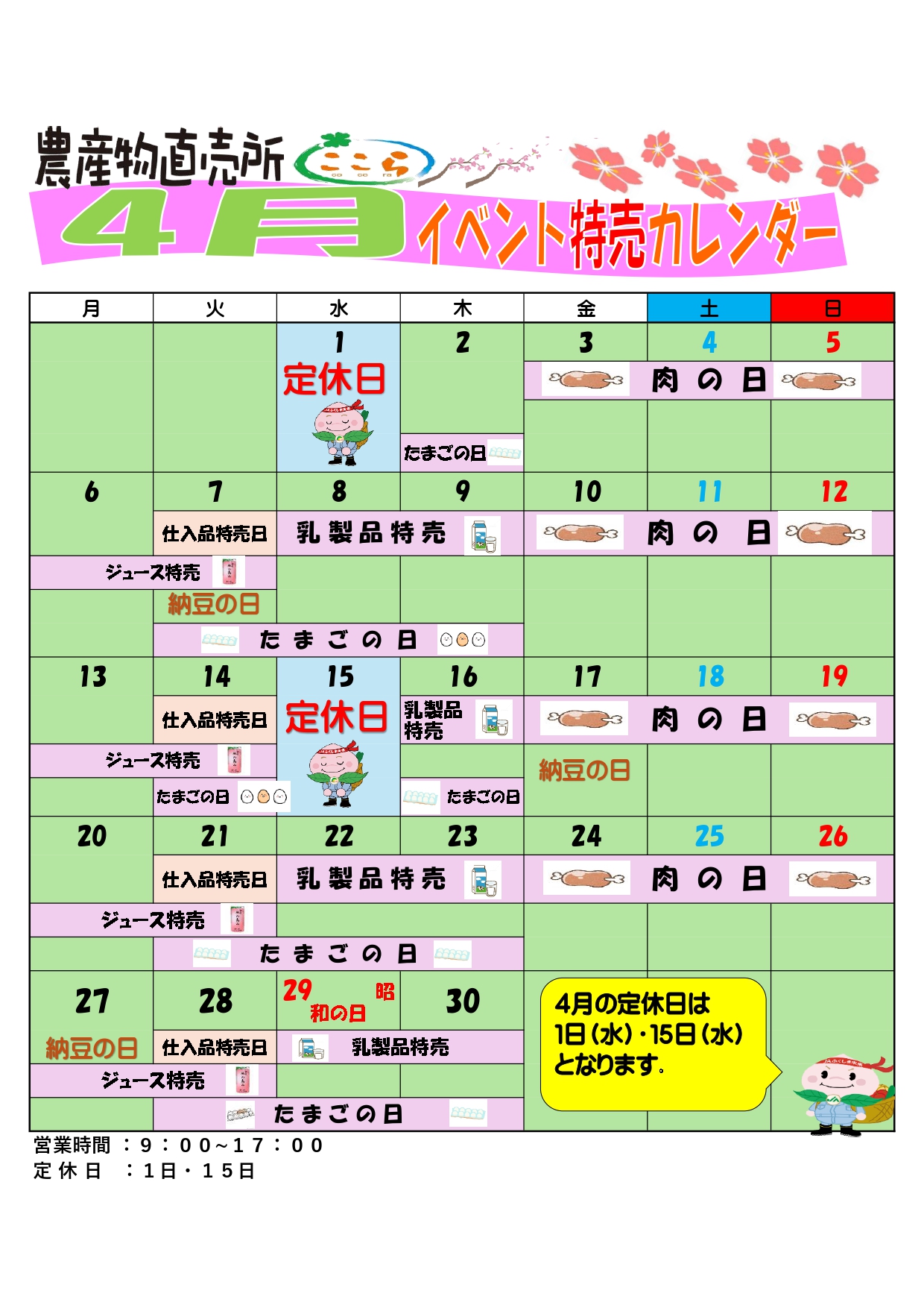 農産物直売所「ここら」4月イベントカレンダー