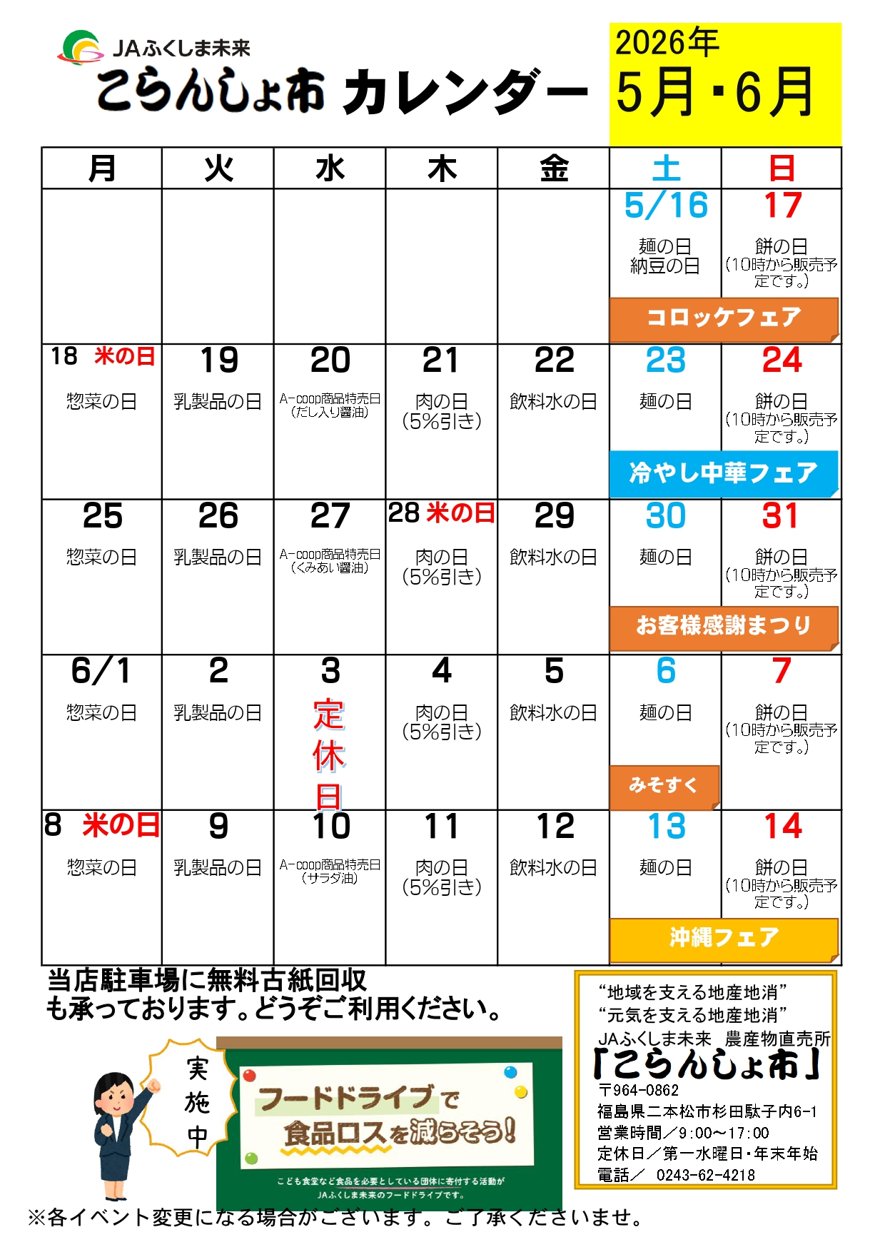 農産物直売所「こらんしょ市二本松店」5月イベントカレンダー