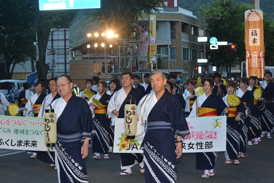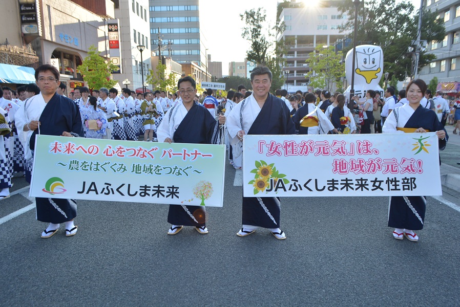 福島を代表する祭りである「わらじまつり」が3日と4日に福島市内で行われ、当JA女性部福島地区本部の皆さんや新入職員など約200人がわらじ踊りに参加しました。今年は、当JAと友好協力協定を結ぶ「エフコープ生活協同組合」の皆さんにも参加していただき、多くの観客に協同組合や旬の桃をPR。見事、6年ぶりとなる「大わらじ賞」を受賞することが出来ました。