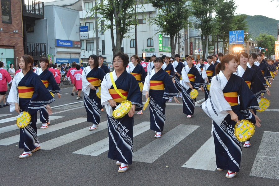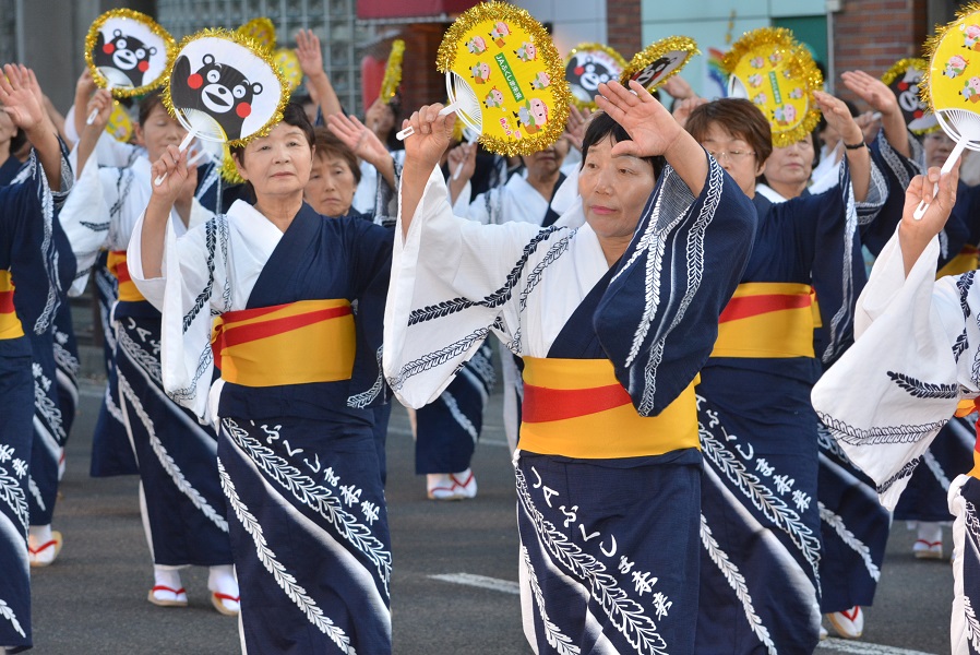 わらじ踊りの第1部と第2部で繰り広げられた「平成わらじ音頭」がわらじまつりで披露されるのは今年で最後となり、来年からは新しい踊りが導入される予定です。今年は33団体から約3,200人が参加しました。当JA女性部は第1部に参加し、お揃いの浴衣とうちわで息の合った踊りを披露。橘内弘子女性部長とJAの役員、エフコープの皆さんは提灯と横幕を持って先頭を歩きました。ステージ上でのPRタイムでは橘内部長とエフコープの秋成紗恵子さんが登壇し、旬の桃をPR。秋成さんは「福岡でも福島の美味しい桃をたくさんPRしたい」と話していました。