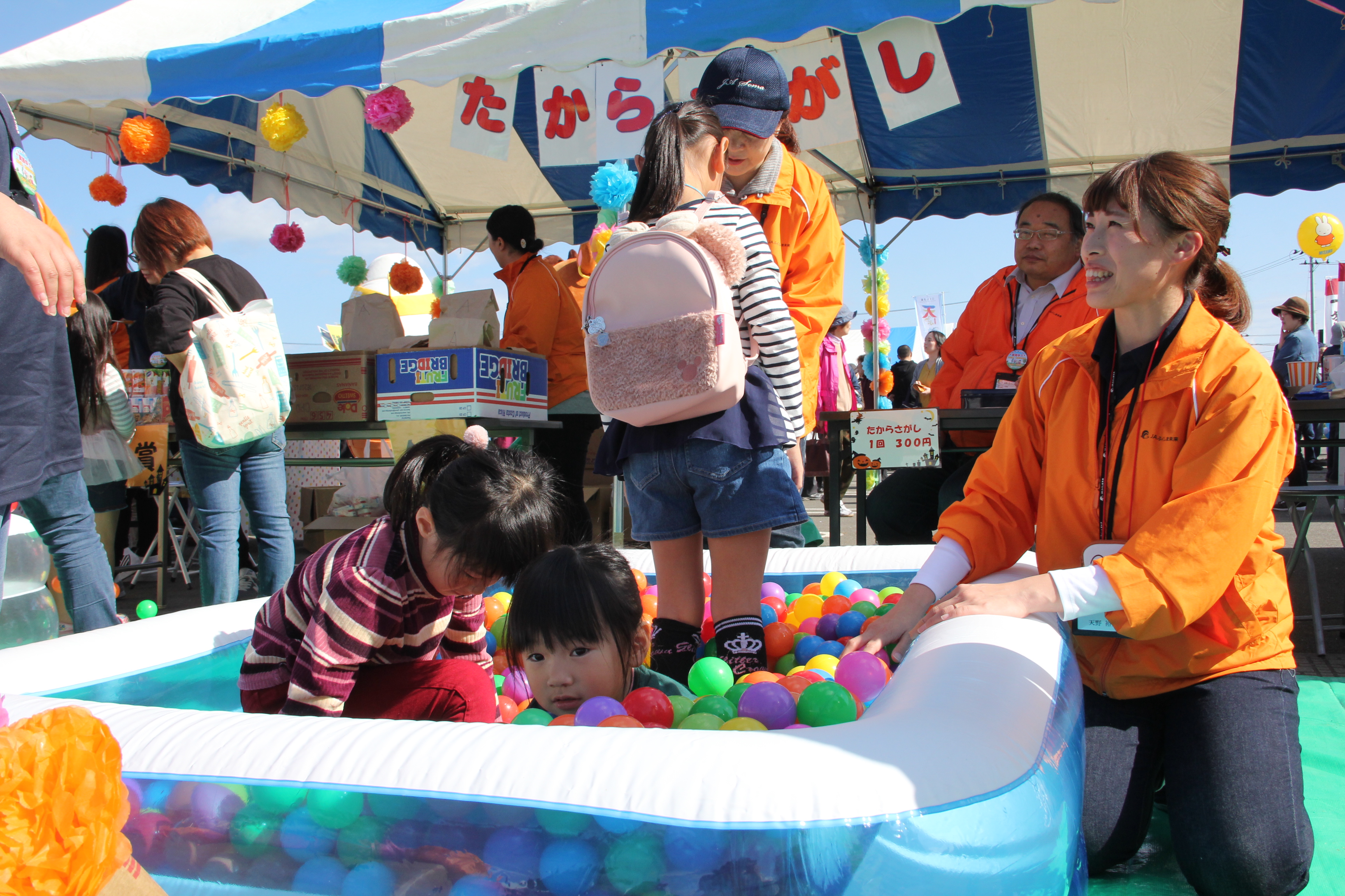ステージイベントでは、役職員がメンバー入りした歌・演奏・ダンスを披露。支部対抗玉入れ大会では白熱した戦いが繰り広げられました。また、野菜つかみ取り大会やビンゴゲーム、投げもちを開催し、来場者にも参加していただきました。2日目には、ものまね芸人のホリさんが登場して、レパートリー豊富なものまね芸で会場を盛り上げました。