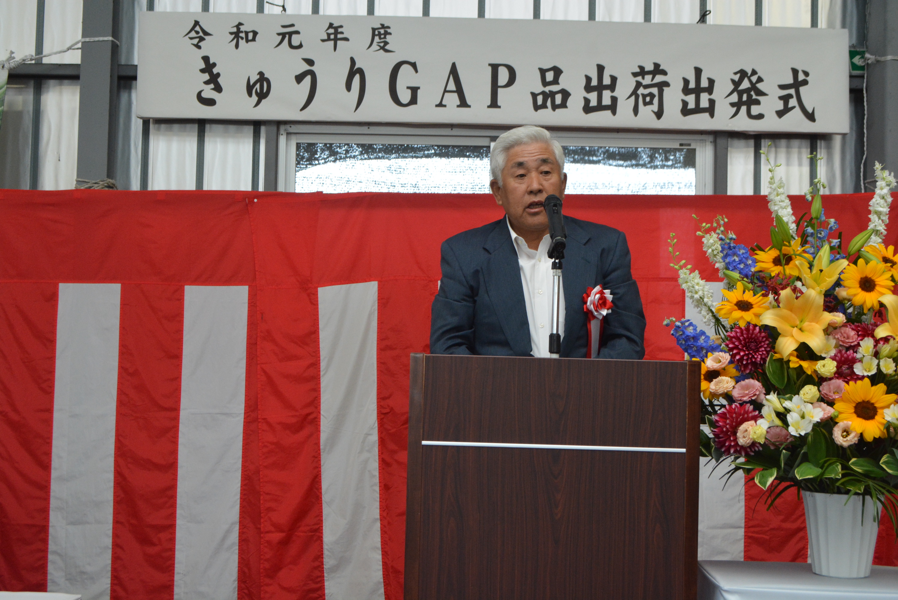伊藤昌廣専務は「全世界に安心・安全を届けるのがGAP品。生産現場を大事にしたJAの経営・出荷でGAP品のさらなる生産拡大につなげたい」とあいさつ。きゅうり連絡協議会橘一郎会長は「JGAP認証取得きゅうりの、日本一の産地を目指して一丸となって取り組もう」と呼びかけました。