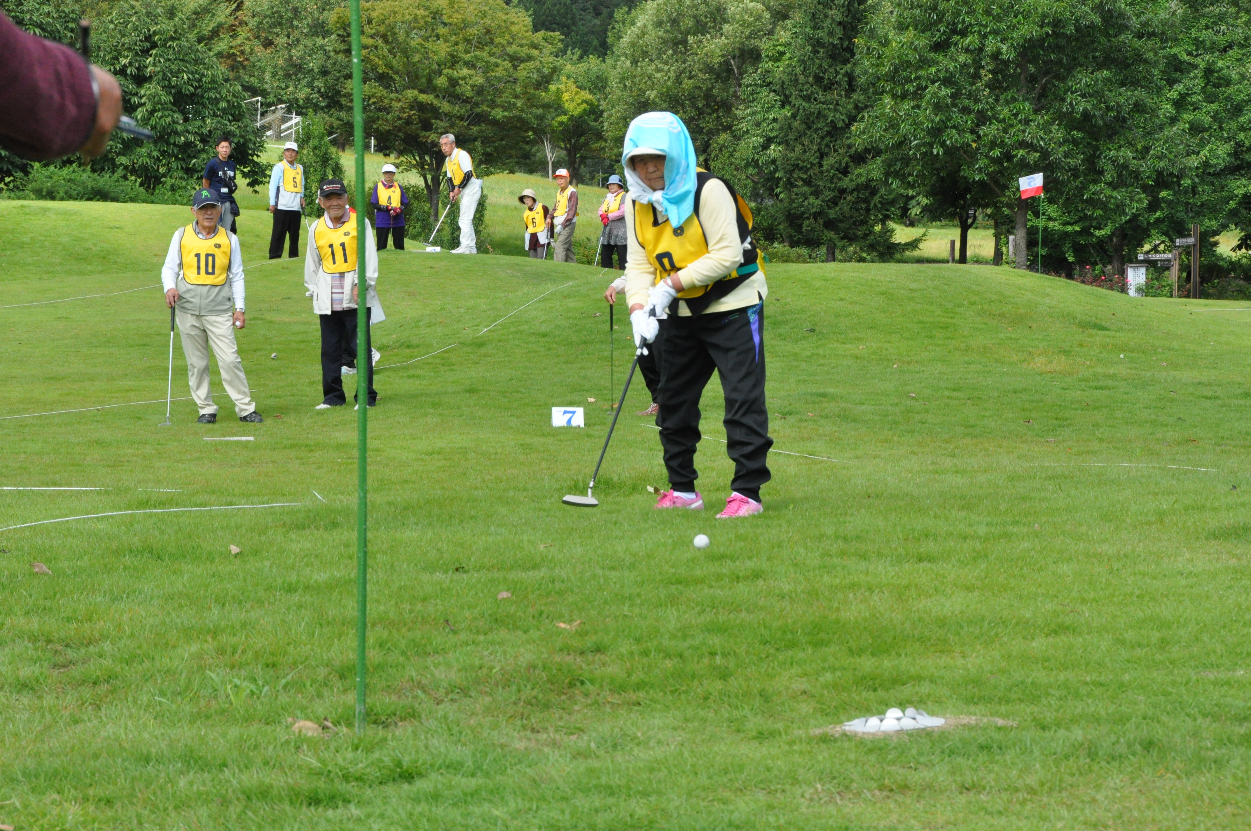 当JA年金友の会福島地区は19日、あづま総合運動公園で「第4回ふれあいミニゴルフ大会」を開きました。管内18地区から19チーム105人が参加。開会式では立子山支部の三浦善夫さんが選手宣誓をし、同会の平田無着会長やJAの永澤信弘役員代表らが始球式を行い試合がスタートしました。
