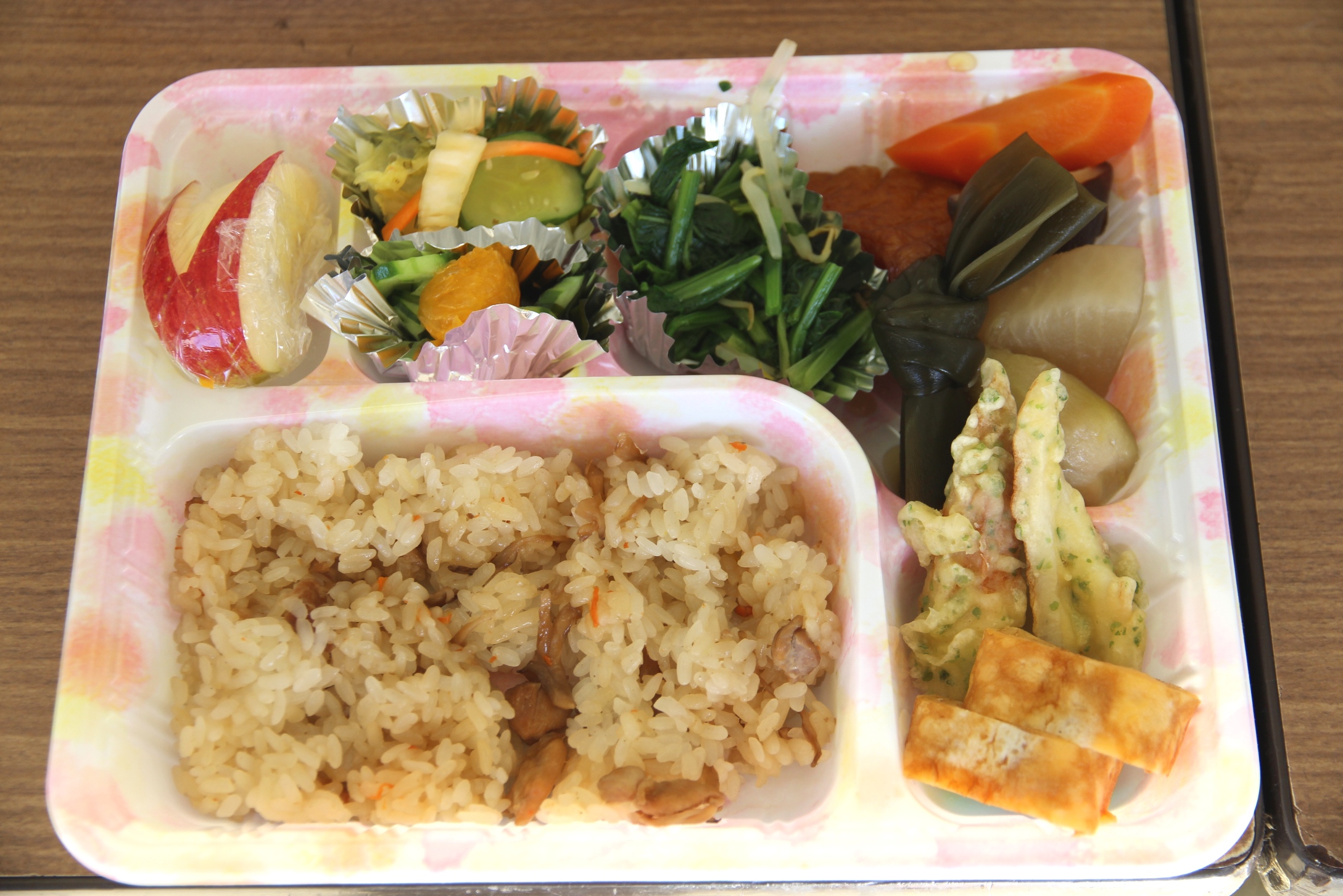 同会の会員ら18人が調理を担当。お弁当には、味ぶかしや煮物、ほうれん草のおひたし、厚焼き卵、ちくわの磯部揚げ、酢の物、漬物、果物と、会員手作りの料理が彩り良く詰められました。材料の米や野菜は、会員らが自家栽培のものをそれぞれ持ち寄ったもの。野菜を多く取り入れたり、リンゴを食べやすいサイズに切り分けるなど、随所に会員らの真心と工夫が込められています。