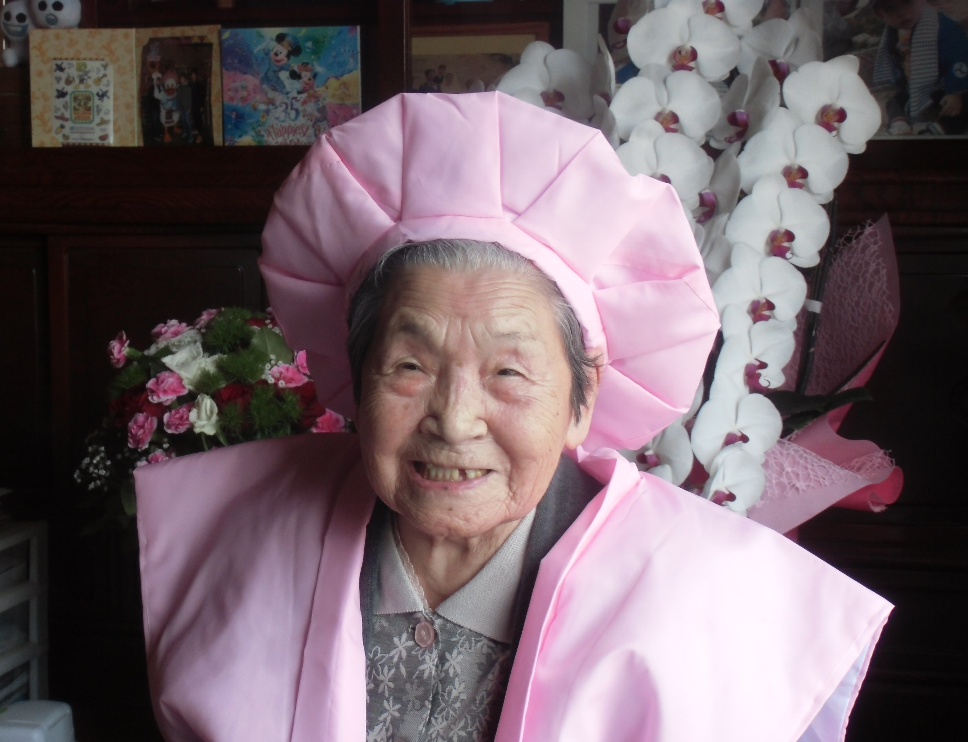 テル子さんは、ひ孫から花束を受け取りとてもうれしそうでした。