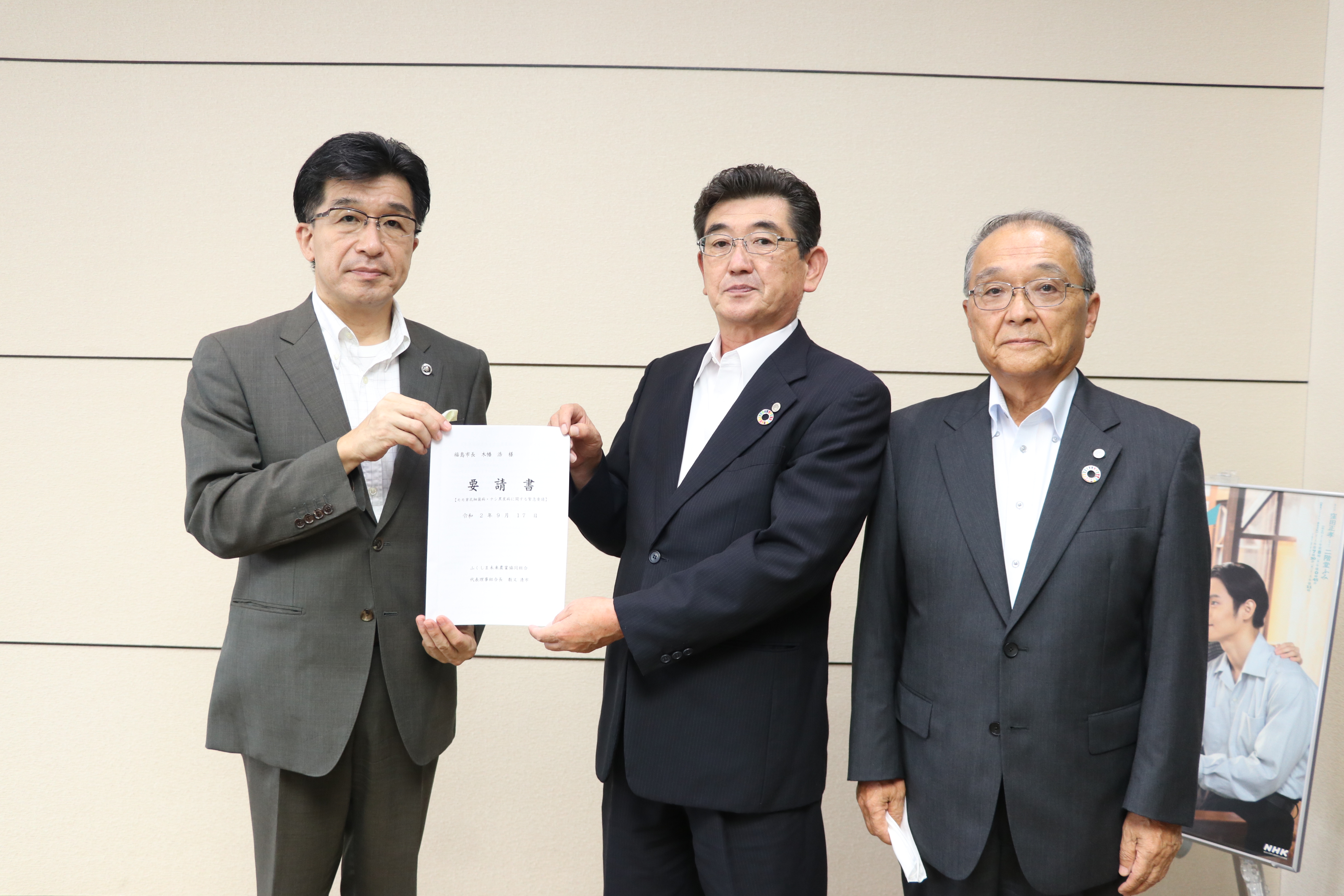 数又清市組合長、宝槻直志専務らが木幡市長を訪れ、発生状況や被害の影響等を説明し、要請書を提出。モモ・ナシともに、昨年の台風による記録的な豪雨により、菌密度の増加が助長。生産者らは、早期から薬剤防除、耕種的防除を徹底してきたが、被害発生を止められない現状にあります。そのため、JAでは薬剤経費負担予算措置や自然災害被害果実加工利用促進等対策事業実施の追加支援、果樹共済・収入保健の加入促進に伴う掛金負担助成など3項目を要請しました。