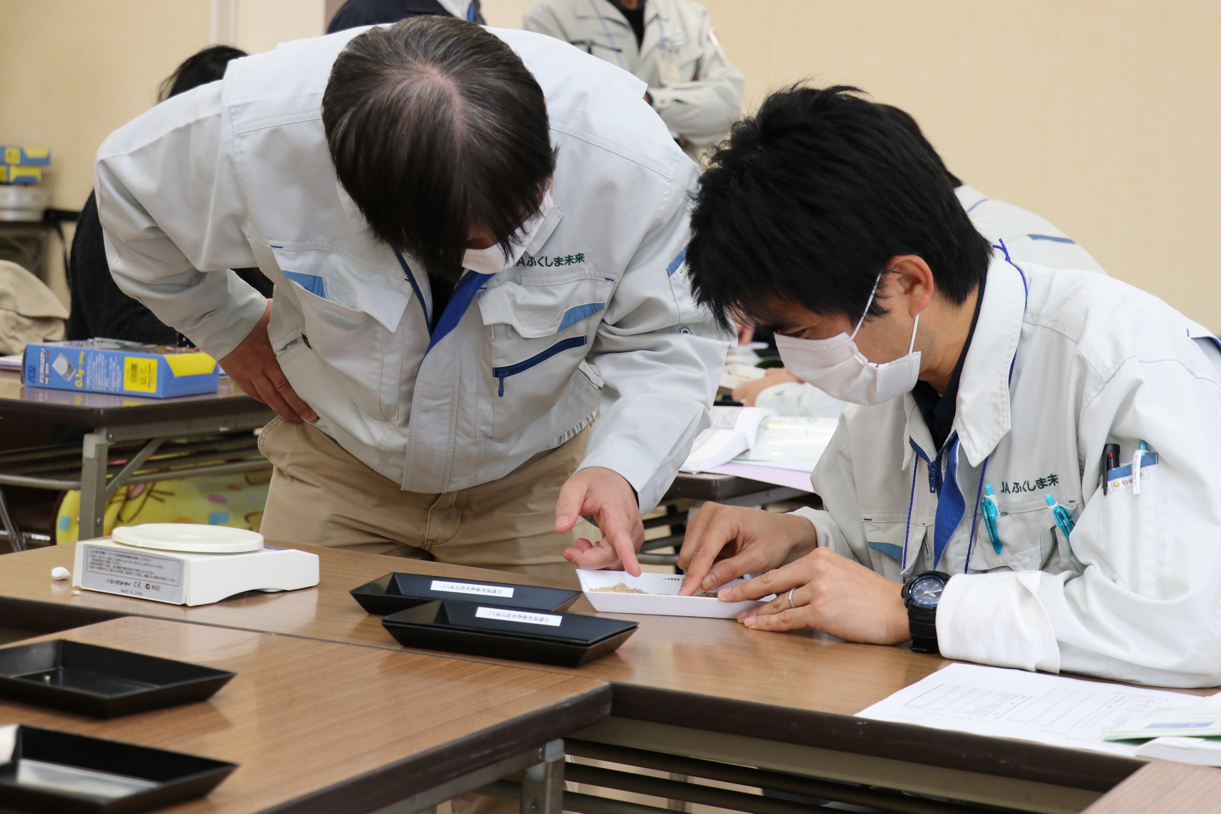 3日には、川俣飯野営農センターで初めての実習を行いました。当JAの農産物指導的検査員らが講師のサポート役を務め、うるち米の分析や鑑定訓練を実施。受講生らは、写真やテキストを参考にしながら、カルトンに入った米粒を注意深く観察していました。