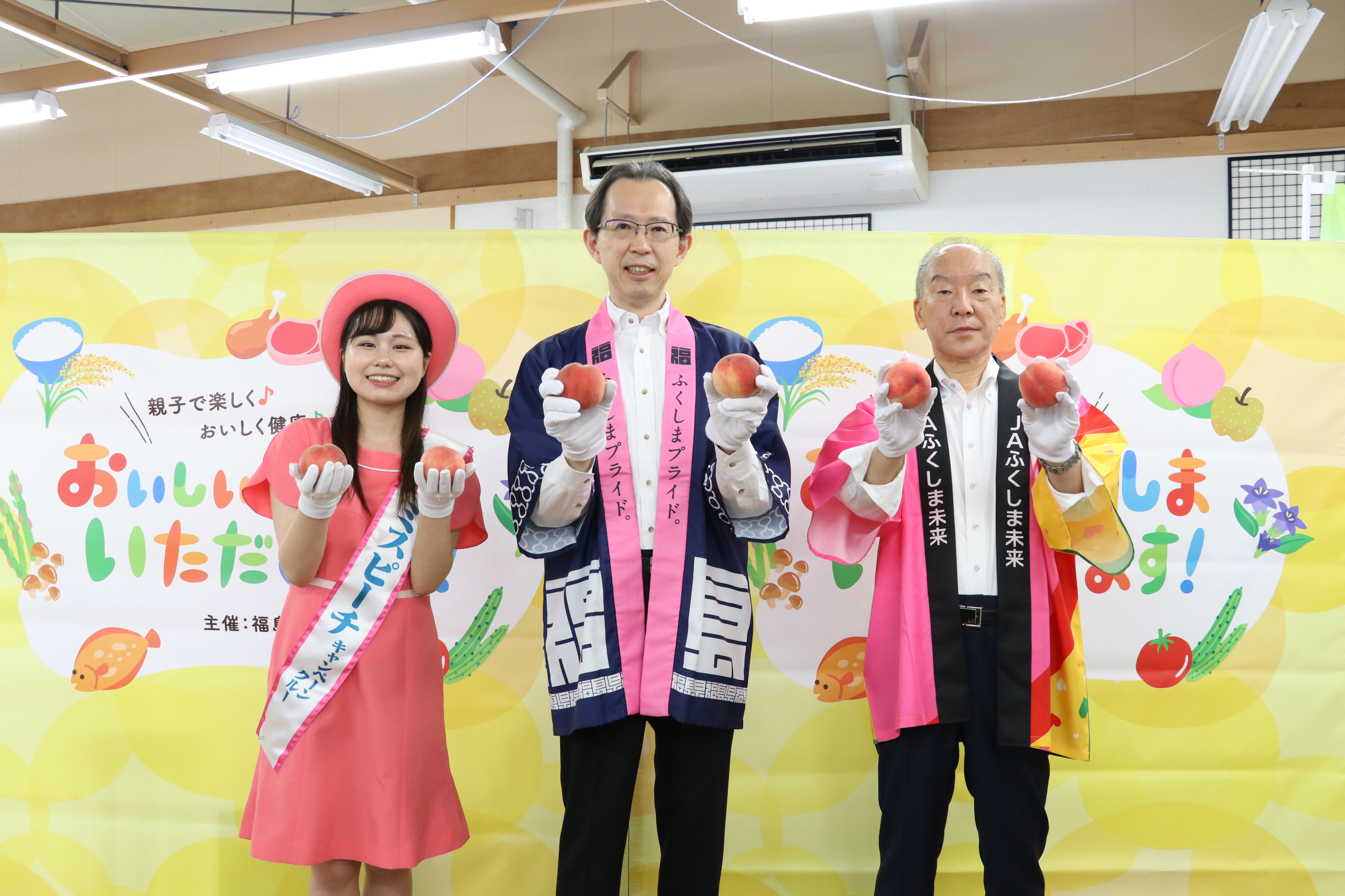 PRイベントには内堀知事と当JA濱田賢次専務、ミスピーチキャンペーンクルー鎌田花華さんが参加。内堀知事は「ふくしまの桃の季節がやってきた。地元のみなさんにたくさん食べてもらうことが大切。力を合わせて県産品をPRしていきたい」と呼び掛けました。濱田専務は「大きくてとても甘い桃が仕上がった。ぜひ味わってほしい」と話し、来場者へ当JA6次化商品「桃の恵み」「桃の黄わみ」のドリンクセットを先着50人にプレゼントしました。