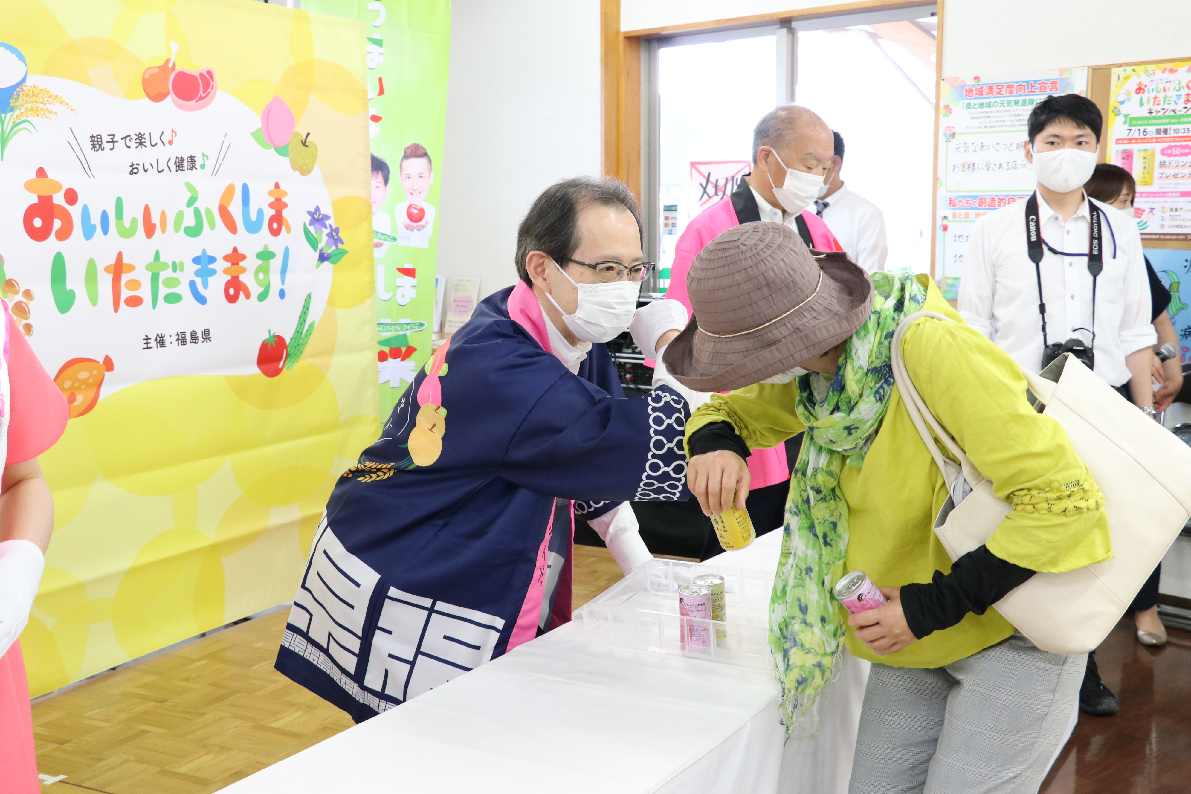 福島県の内堀雅雄知事は16日、当JA農産物直売所「みらい百彩館んめ~べ」で、くだもの王国ふくしまを代表する旬の桃をPRしました。