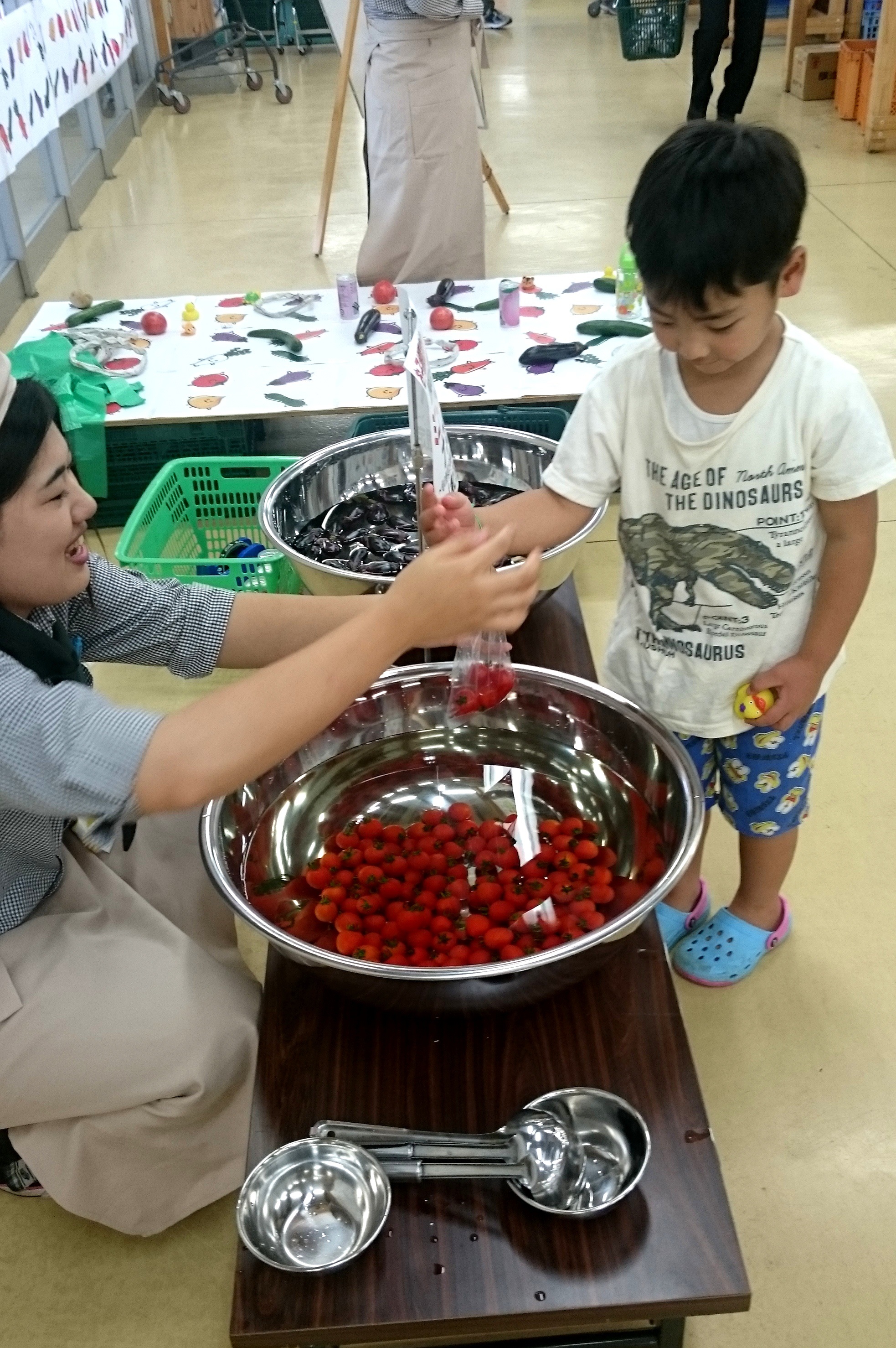 子ども向けのイベントでは、野菜輪投げ、ミニトマトすくい、ナスすくいが行われました。輪投げでは、ジャガイモ、玉ネギ、ニンジンの野菜とカレールーがセットになった「カレー野菜セット」や、同じく「シチュー野菜セット」、「野菜サラダ」などの商品やオモチャなどが並び、輪投げに挑戦する子どもたちの元気な声が店内に響きました。