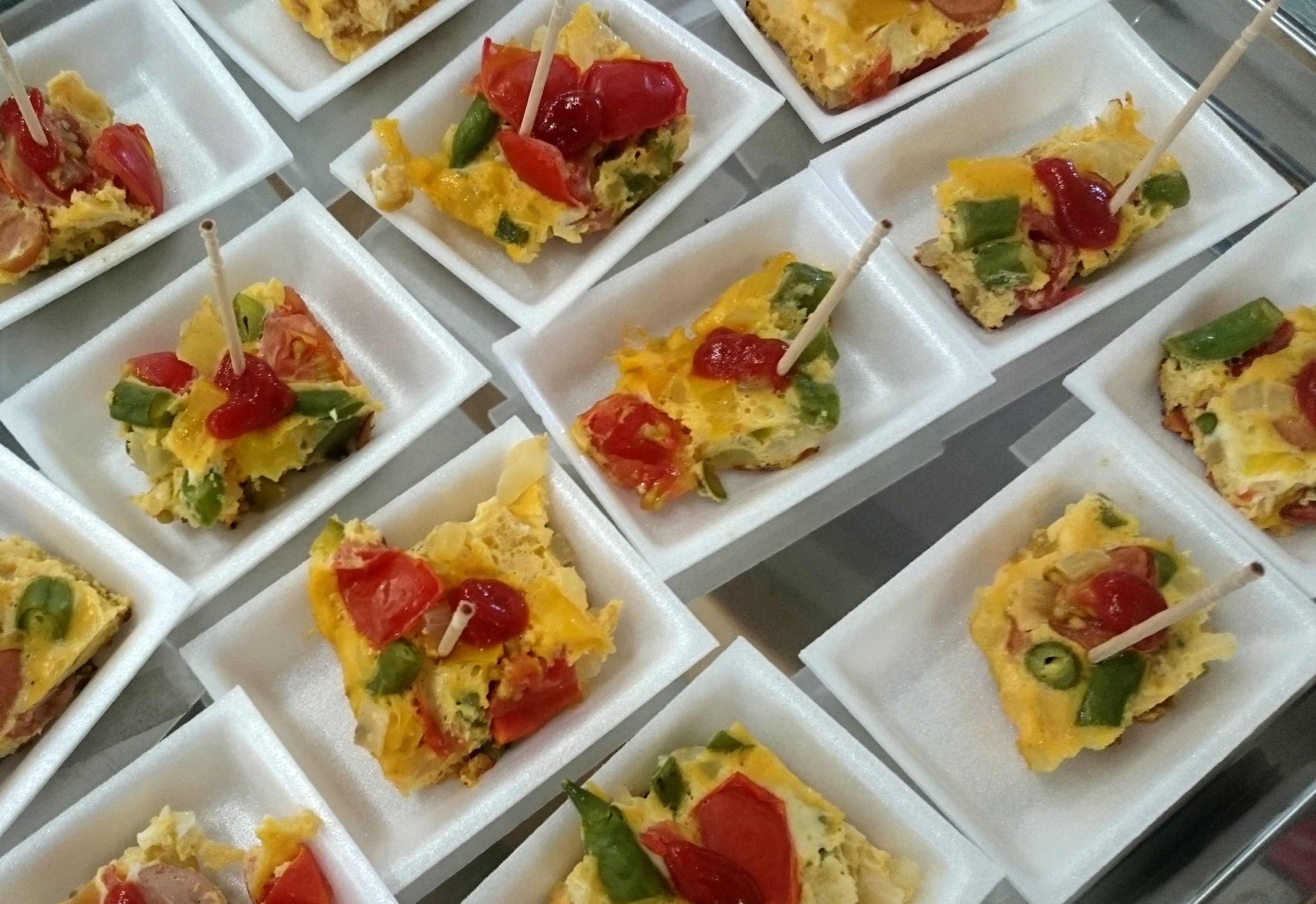 「やさいの日」のイベントでは、同地区のベジフルコーディネーターのメンバーらが、旬の野菜を使ったレシピ紹介・試食や子ども向けのゲームを企画しました。レシピ紹介では、ミニトマトやインゲン、パプリカ、玉ネギなどの野菜をふんだんに取り入れたオープンオムレツを提案。訪れたお客様に試食を振る舞い、レシピを配布して作り方を紹介しました。