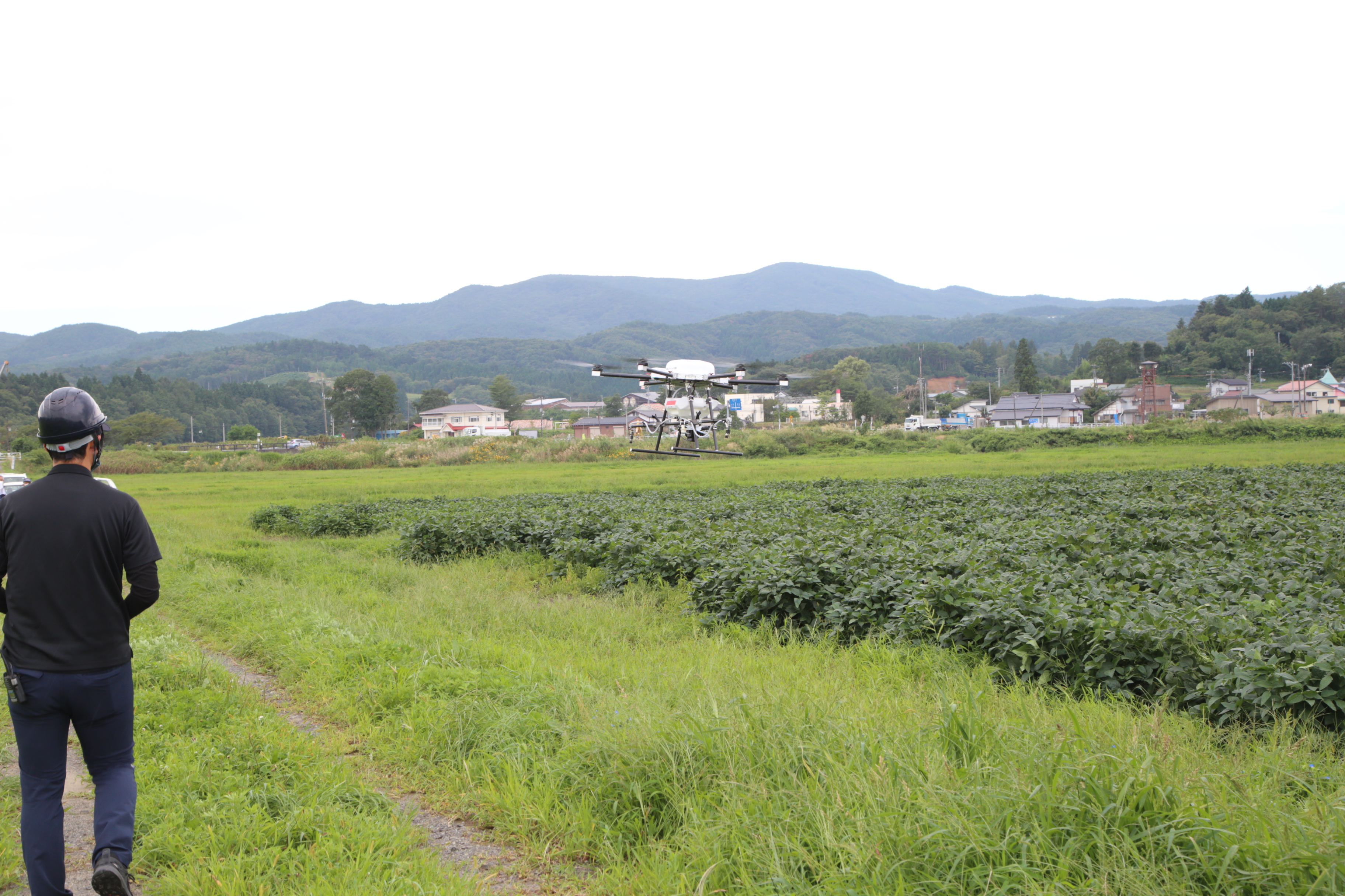 関係者ら40人が参加し、同社の担当者が機体特性や効率的な散布による利便性を説明しながら大豆のほ場180aで散布の実演をしました。