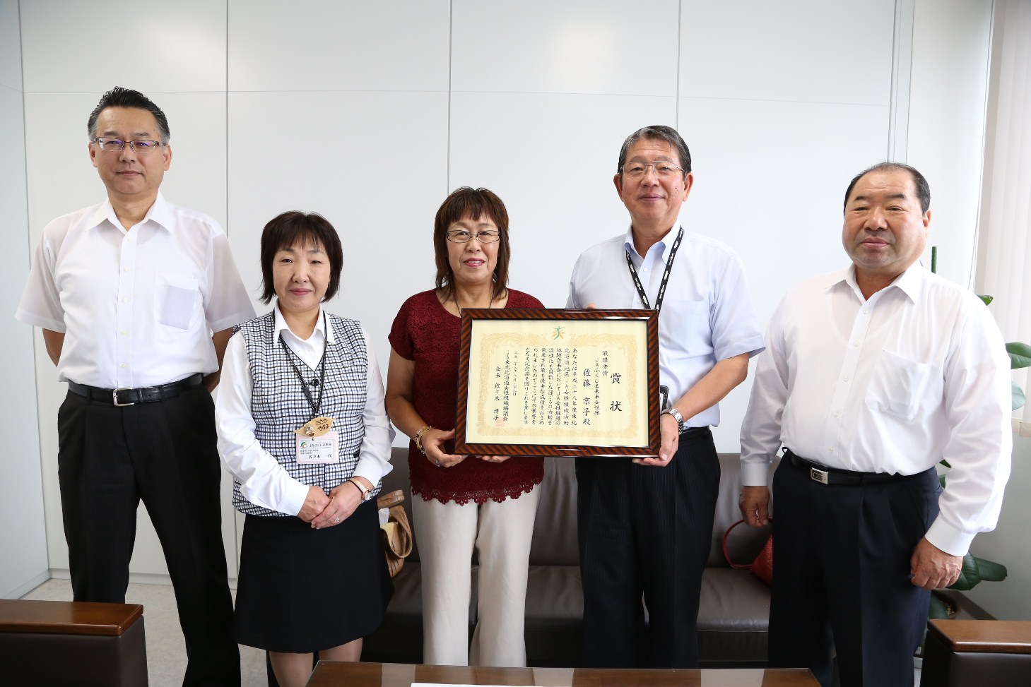 8月25日~26日に北海道札幌市で開かれた「東北北海道地区JA女性組織リーダー研修会」の組織活動体験発表で、最優秀賞に輝いた女性部伊達地区の佐藤京子さん(富野支部長)が29日、本店を訪れ菅野孝志組合長ら役員に、最優秀賞受賞と全国大会出場を報告しました。