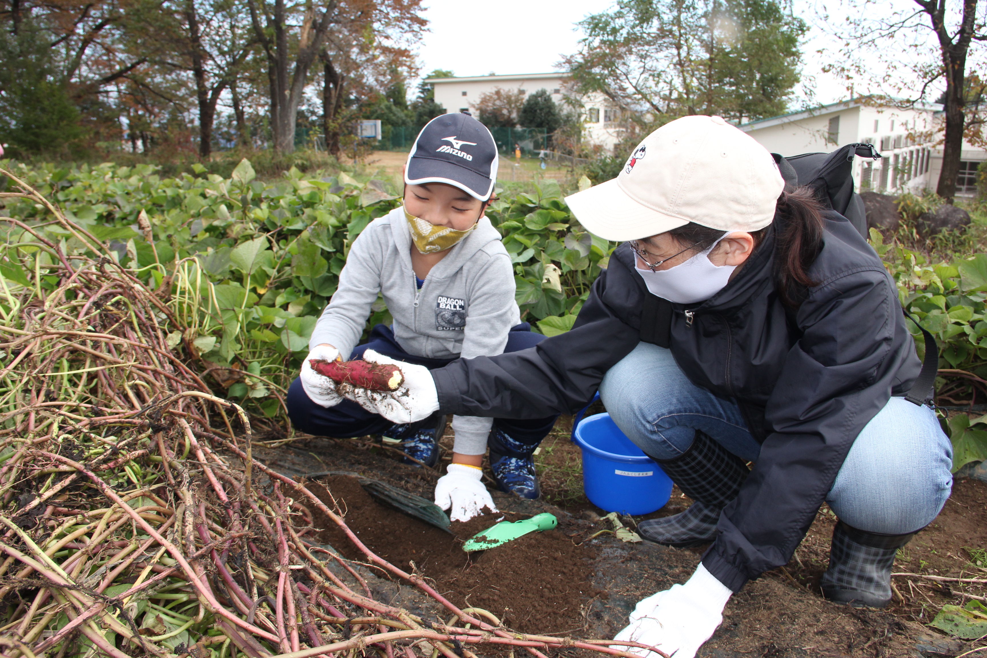 親子7組20人が参加して、サツマイモの収穫体験とサツマイモの皮を使ったミニ実験が行われました。