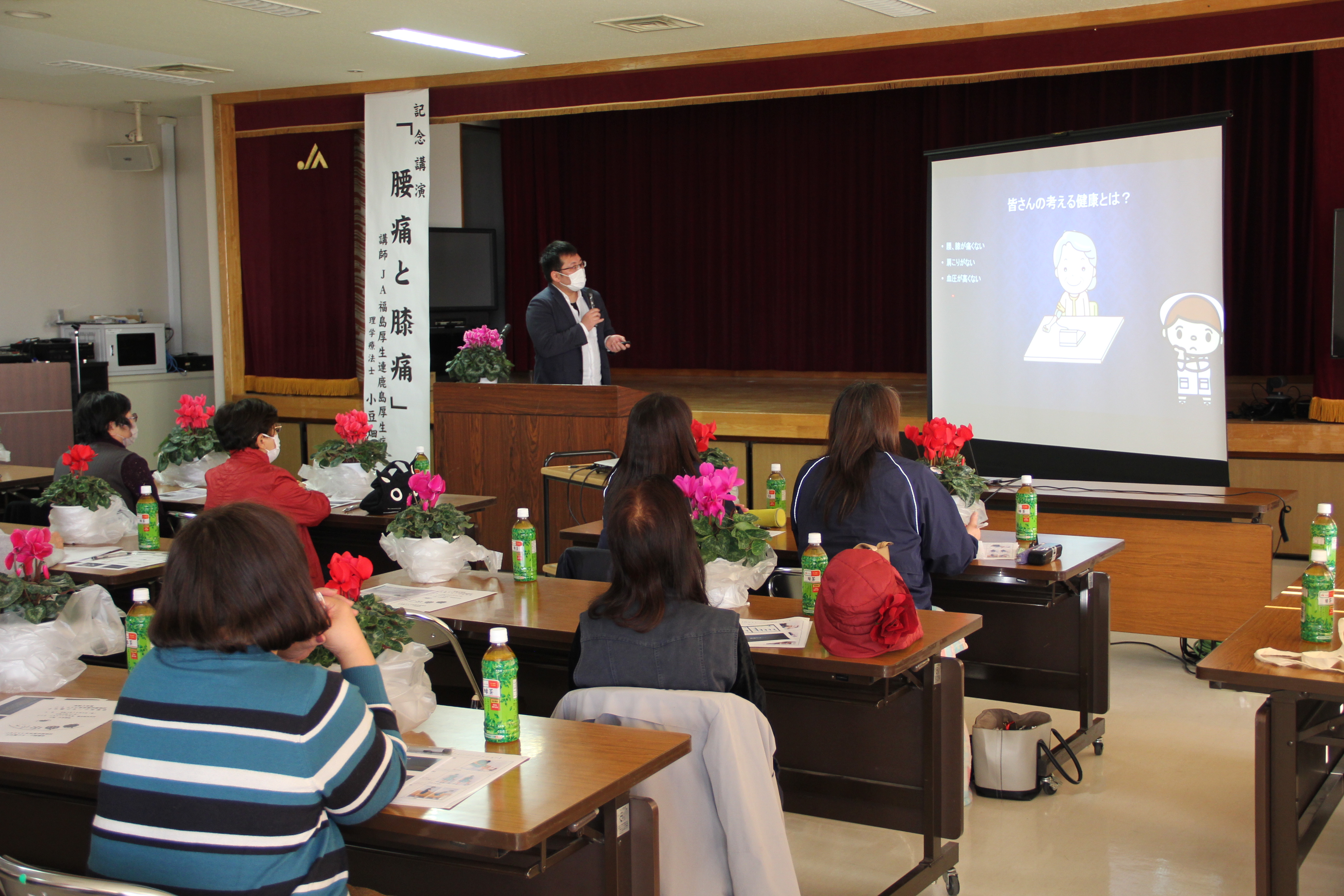JA福島厚生連鹿島厚生病院 小豆畑 健 理学療法士を招いて「腰痛と膝痛」についての記念講演が行われ「腰痛や膝痛も早期の診断と治療が大切です」と話されました。