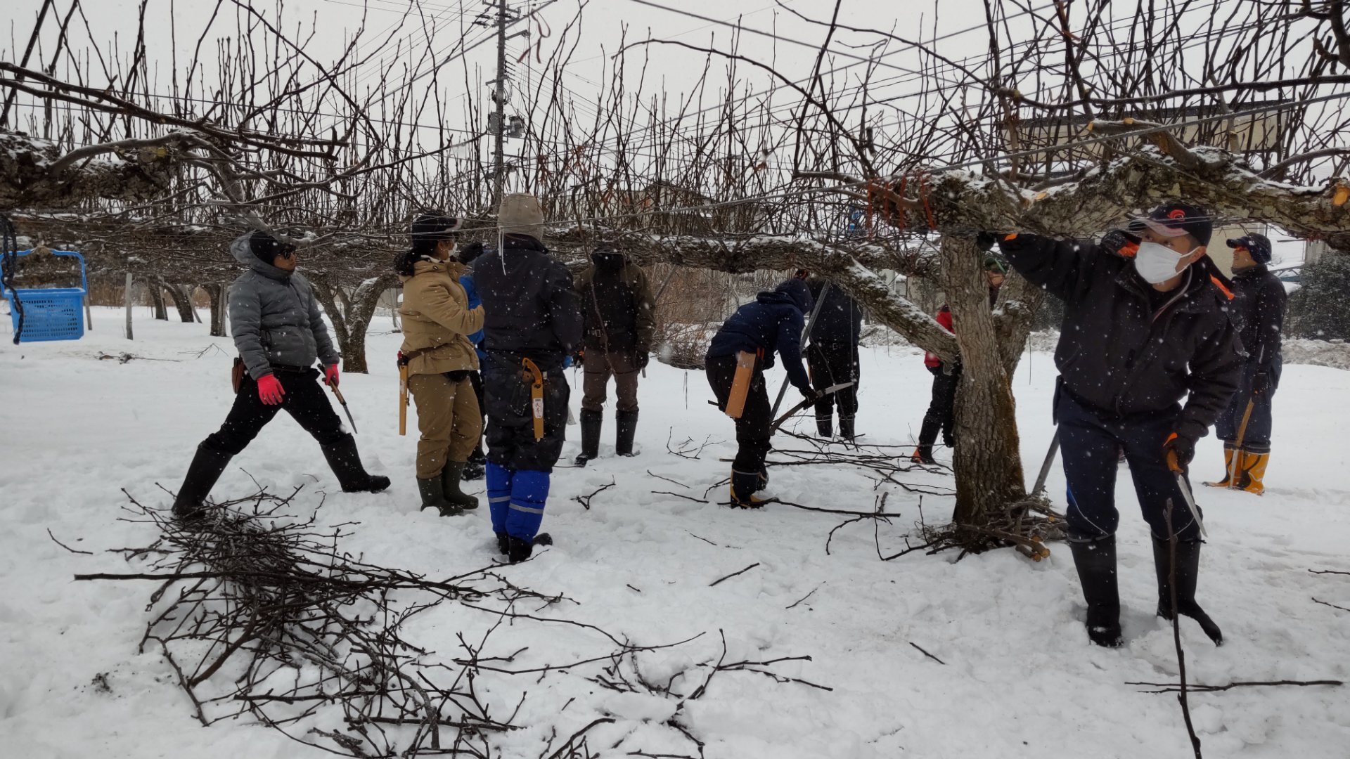 講師は先輩指導員である福島地区農業振興課の加藤忠雄さん。営農指導員10人が参加し、剪定の具体的なポイントを学びました。その後、全員で剪定を実践。加藤さんは「経験を重ねることが大事。できるだけ多くの園地に足を運びスキルアップしていこう」と呼び掛けました。