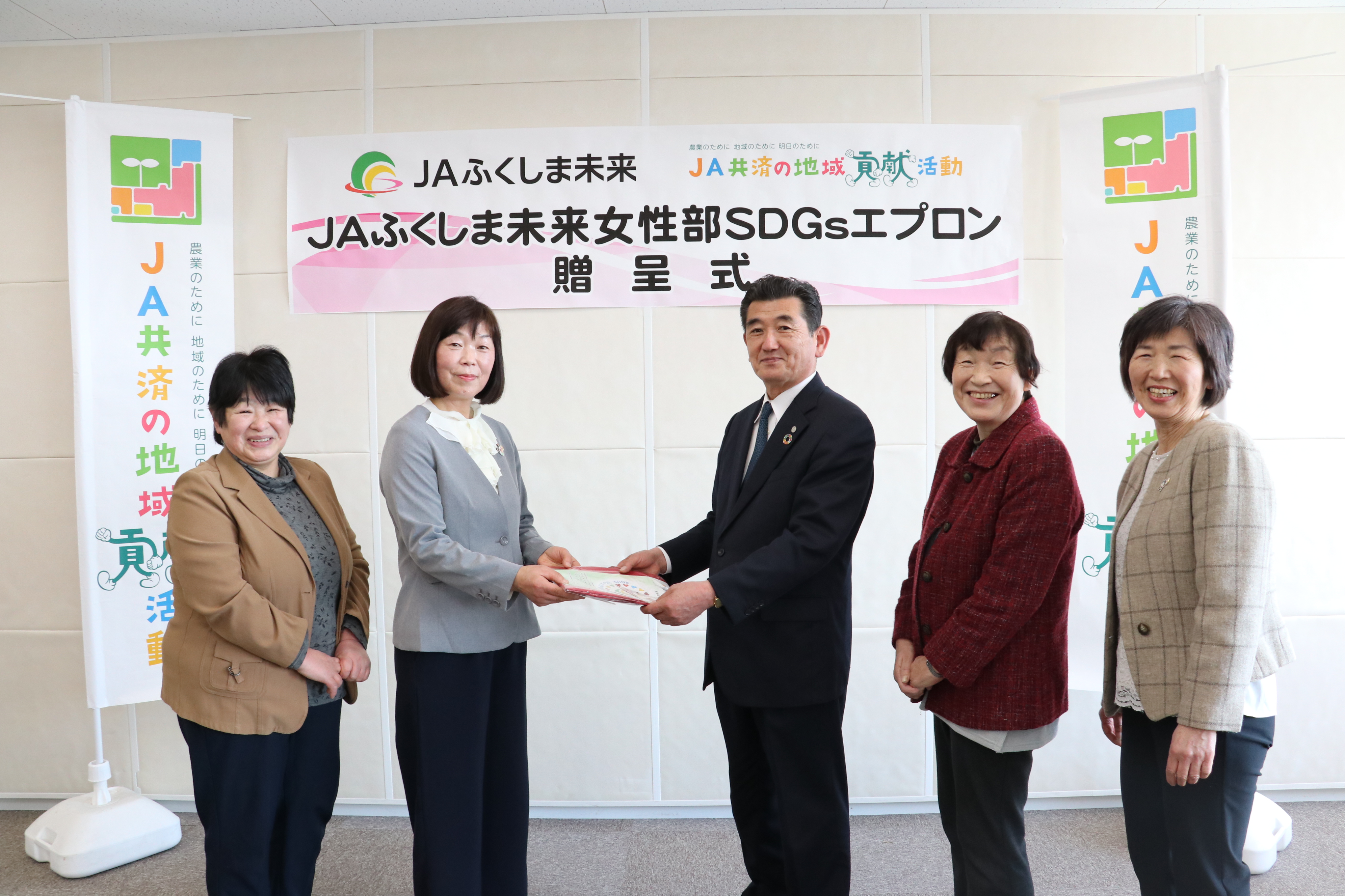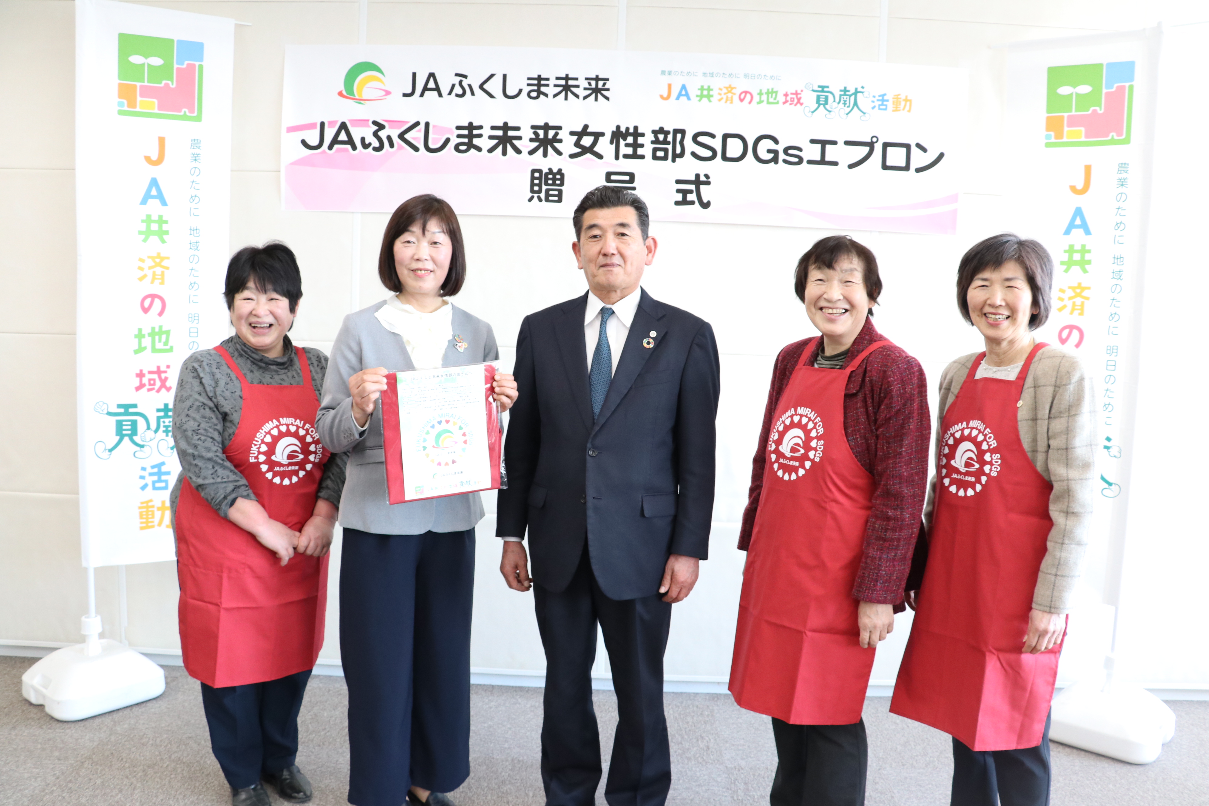 10日、本店で贈呈式を開催しました。数又清市組合長が女性部役員へエプロンを手渡しました。数又組合長は「SDGsを理解・意識した活動で、地域をさらに盛り上げて欲しい」と話しました。