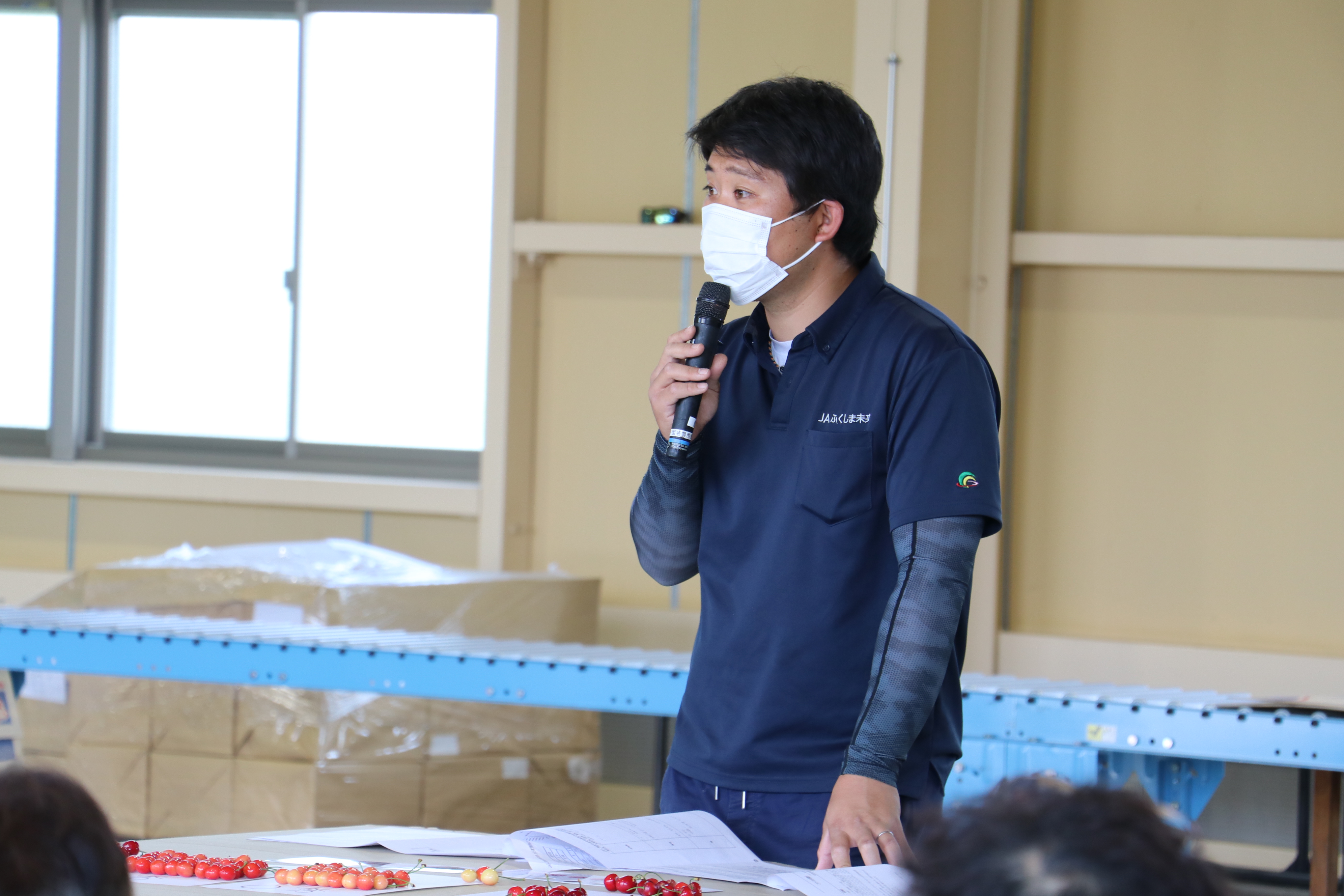 小川集荷場で開いた指導会には部会員約40人が参加。飯坂営農センター営農指導係の斎藤朋也さんが他産地の情勢やオウトウの生育概況、出荷規格等を説明しました。