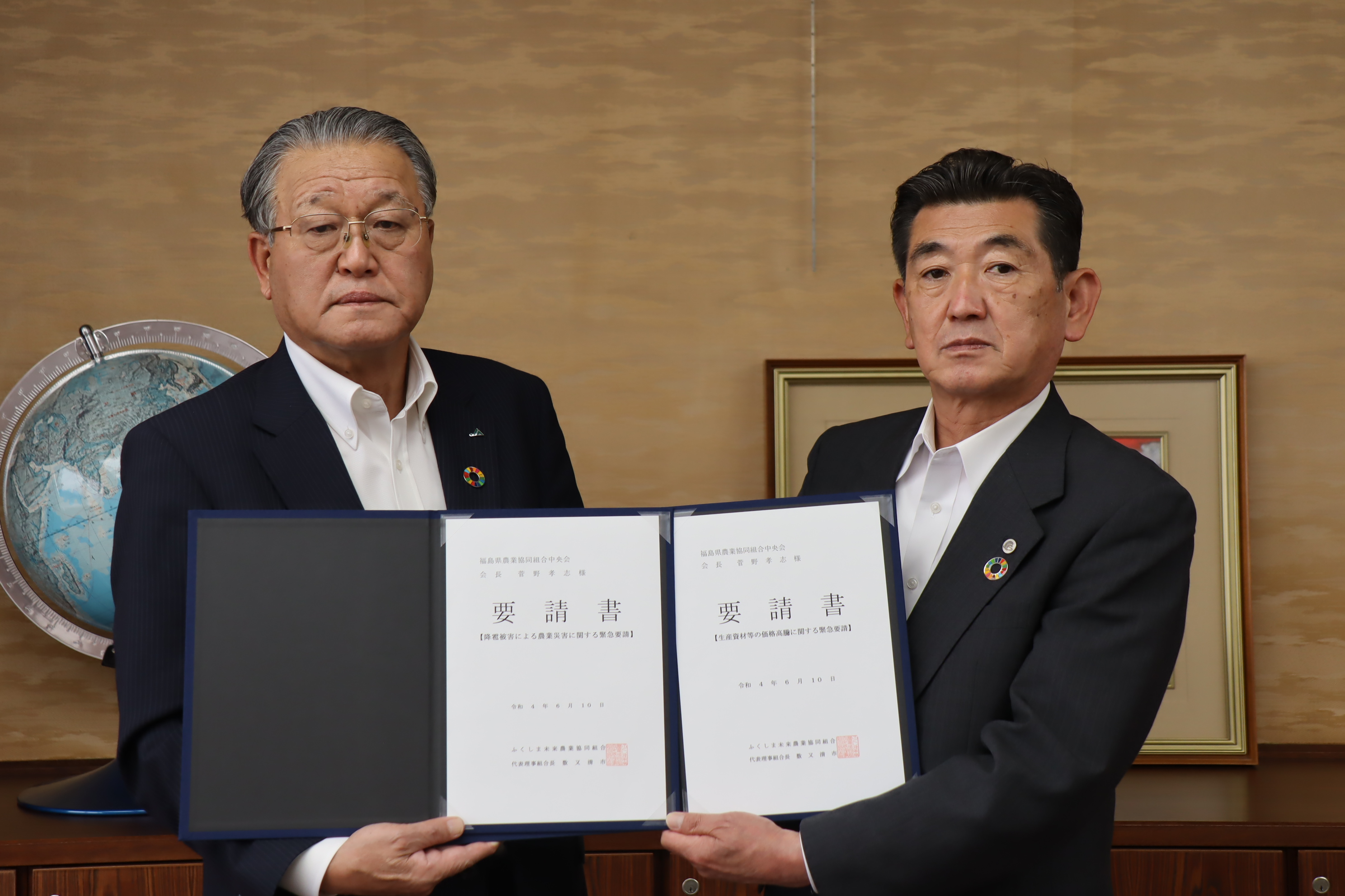 当JAは10日、5月から4回にわたり管内を直撃した降雹被害による農業災害に関して、JA福島中央会へ緊急要請書を提出しました。数又清市組合長が同会を訪れ、長谷川正市副会長に要望しました。