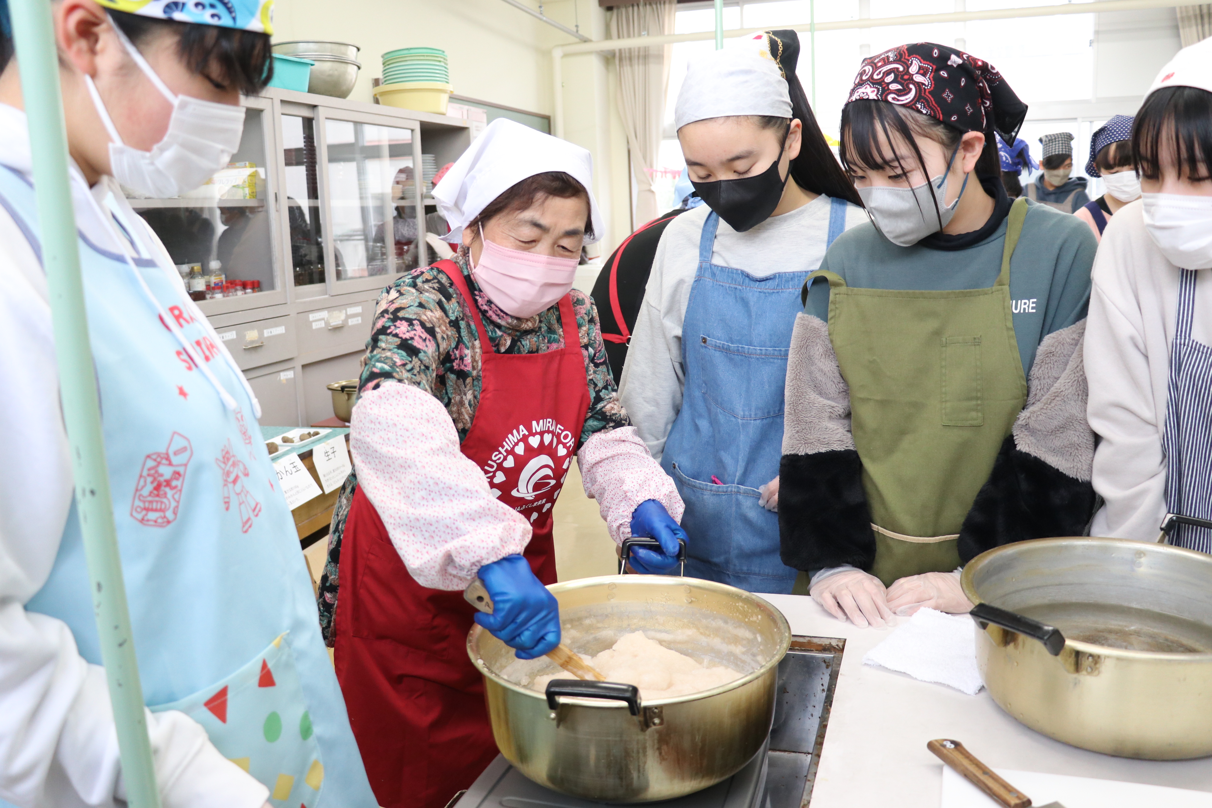 児童らは、すったこんにゃくを鍋に入れ火にかけ固める作業や茹でる作業などを体験。その他、こんにゃく作りに関するDVDを見て地産地消を学びました。